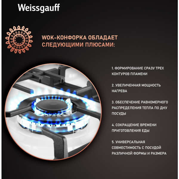 Эмалированная сталь в белом цвете, устойчивая к высоким температурам и простая в уходе, станет органичным дополнением практически для любого дизайна интерьера! На эмалированном покрытии практически не остаются следы от пальцев, а также не прикипают брызги от воды или приготавливаемой пищи. Уникальный эргономичный дизайн решеток дополнит совершенство облика вашей варочной панели, а также сделает более удобным перемещение посуды, снижая вероятность её опрокидывания. WOK-конфорка повышенной мощности, которая создаёт сразу три кольца пламени и позволяет осуществить нагрев даже самой крупной посуды в кратчайший срок.