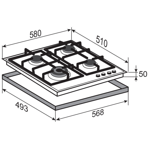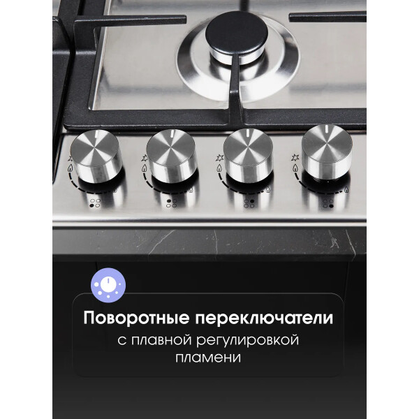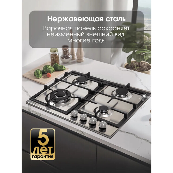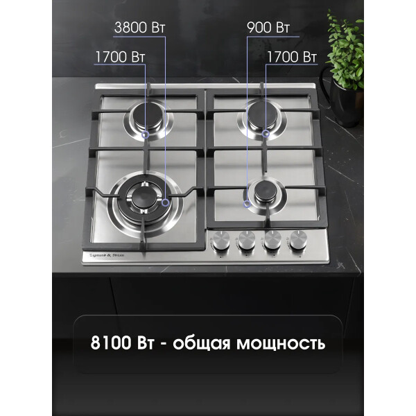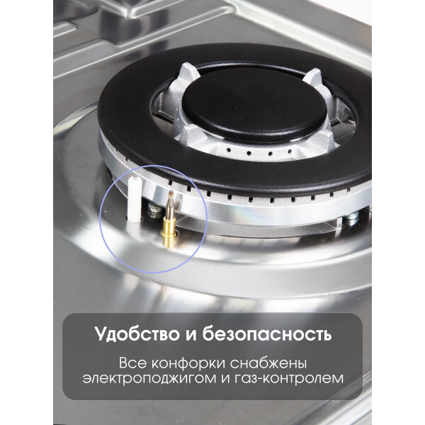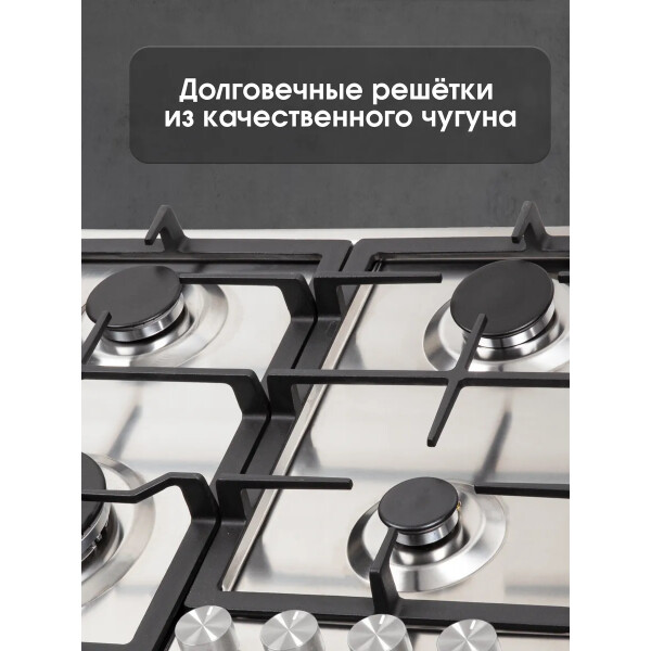 Чугунная решётка обеспечит максимальную устойчивость посуды, а система газ-контроль позаботиться о Вашей безопасности, если пламя случайно погаснет. Мощность горелок Вт: 1 горелка 3.800 Вт, 2 горелки 1.750 Вт, 1 горелка 900 Вт.