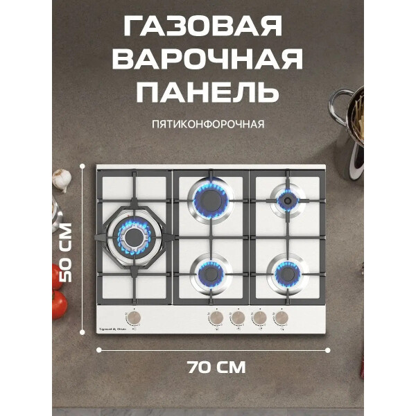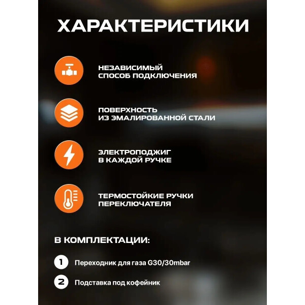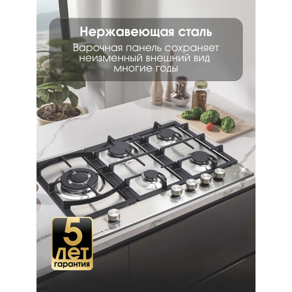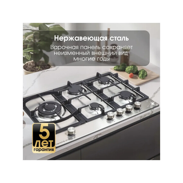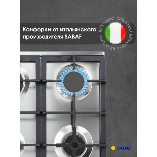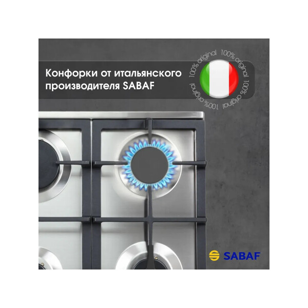 Общие параметры: Фронтальное управление, Поворотные выключатели, Электроподжиг в каждой ручке, WOK горелка, Газ-контроль, Итальянские горелки Sabaf, Чугунные решётки, Матовые колпачки горелок, Подставка для кофейника в комплекте, Переходник для газа G30/30mbar в комплекте.
