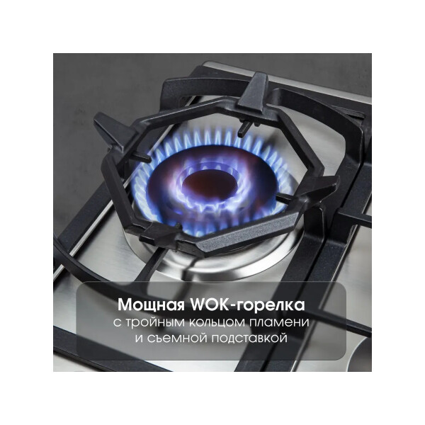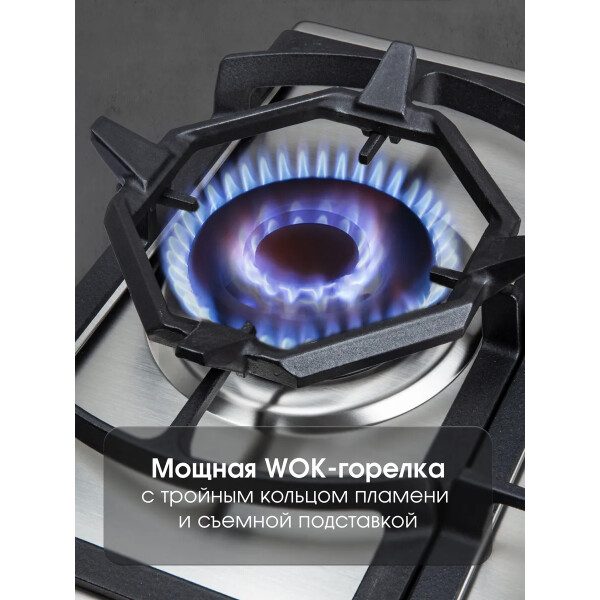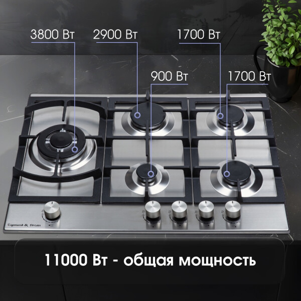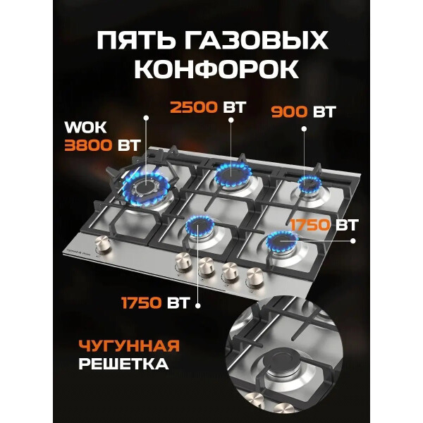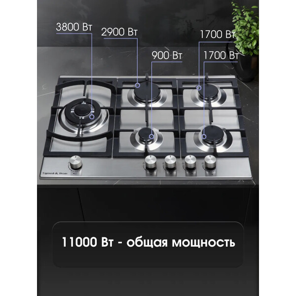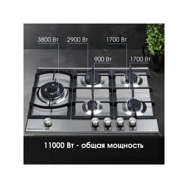 Мощность горелок Вт: 1 горелка WOK 3.800 Вт, 1 горелка 2.500 Вт, 2 горелки 1.750 Вт, 1 горелка 900 Вт.