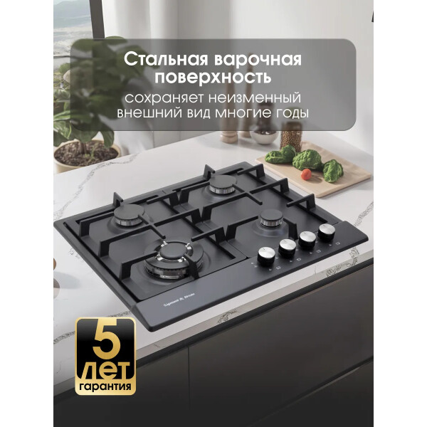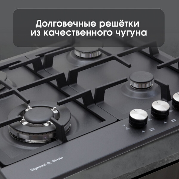 Встраиваемая газовая варочная панель Zigmund & Shtain GN 128.61 B выполнена в чёрном цвете. Ширина 60 см позволит Вам разместить панель в кухнях стандартных размеров. Ваша посуда будет более устойчива на 2-х чугунных решетках, которые покрывают практически всю поверхность этой панели. Панель оснащена системой газ-контроль и электроподжигом в каждой ручке управления. Так же, панель оборудована мощной конфоркой с тройным рядом пламени, что позволит Вам более равномерно прогревать дно посуды и быстро приготовить большее количество еды.