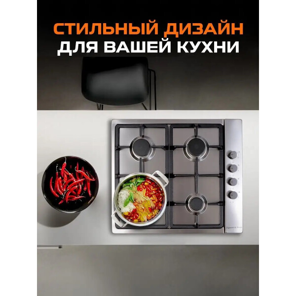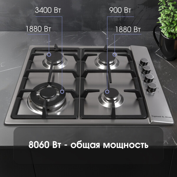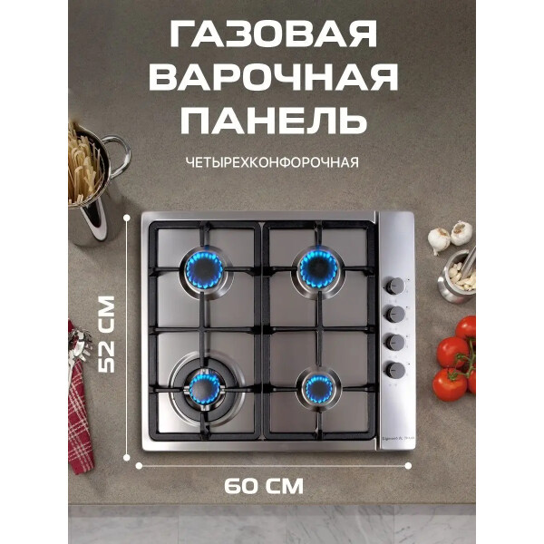 Газовая варочная поверхность Zigmund & Shtain GN 98.61 S располагает четырьмя газовыми конфорками, находящимися на панели из нержавеющей стали. Две конфорки имеют стандартную мощность, одна является экономичной, а одна отличается повышенной мощностью и работает по схеме Тройная корона. Сгорающий в этой конфорке газ образует три контура пламени и равномерно нагревает всю площадь дна сковороды или кастрюли и позволяет значительно быстрее вскипятить воду.