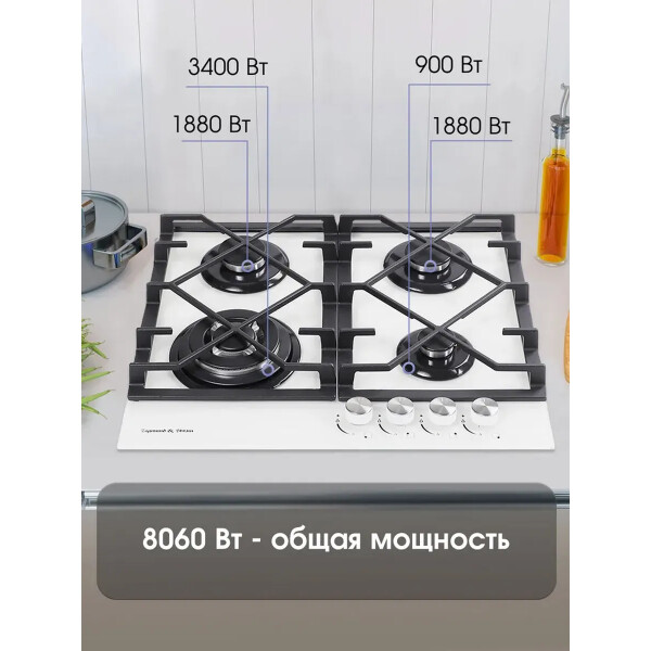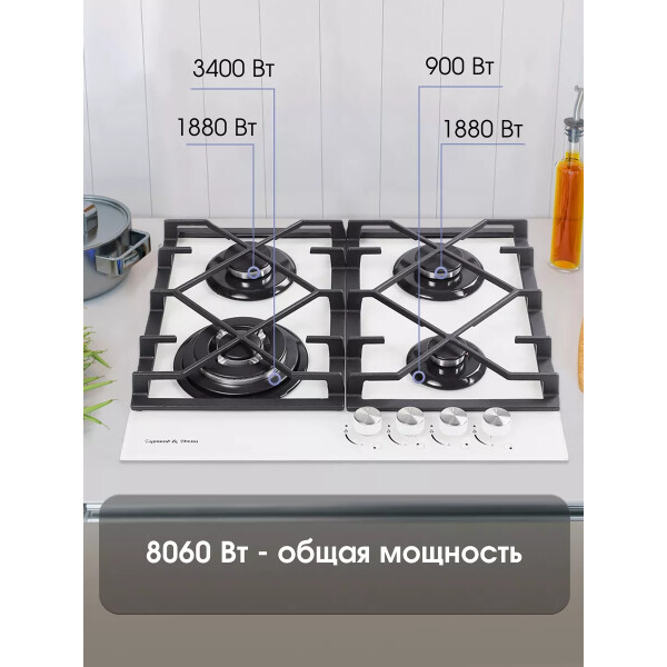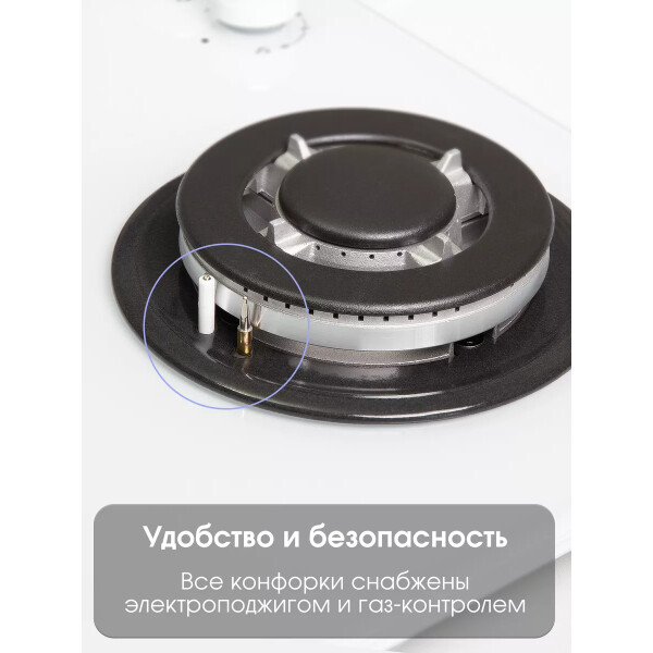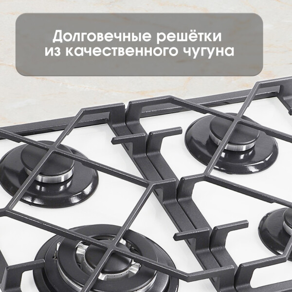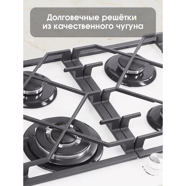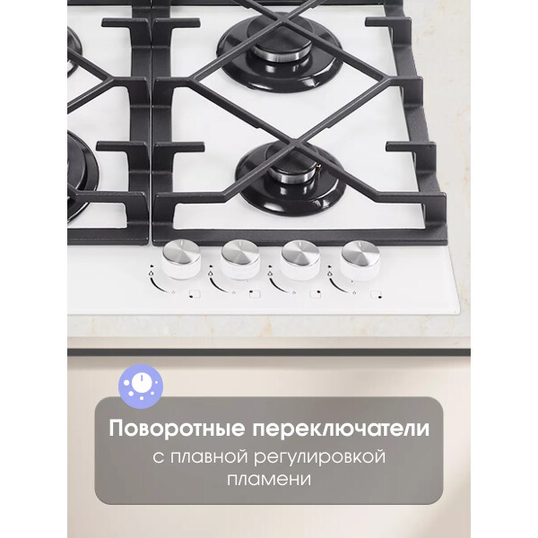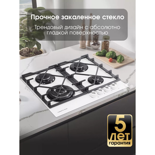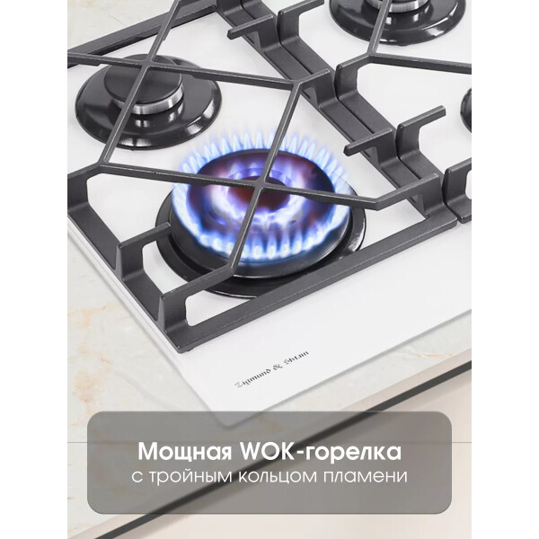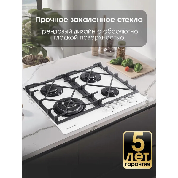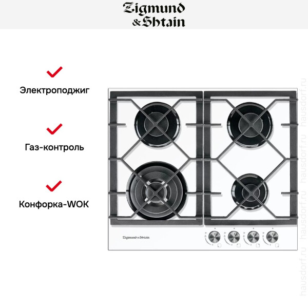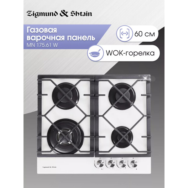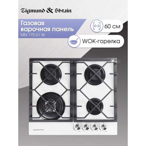 Cовременная варочная панель Zigmund & Shtain MN 175.61 W выполнена из закалённого стекла всемирно известной компанией по производству стекла Schott и оснащена чугунными горелками итальянской компании Sabaf. Автоподжиг добавит комфорт при поджигании горелок, а газ-контроль обеспечит полную безопасность, отключив подачу газа в случае залива пламени горелки. Чугунные решётки помогут посуде прочно стоять на варочной панели.