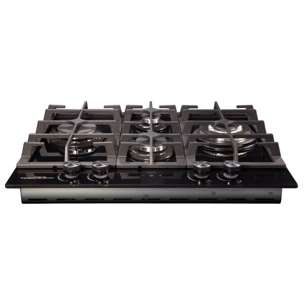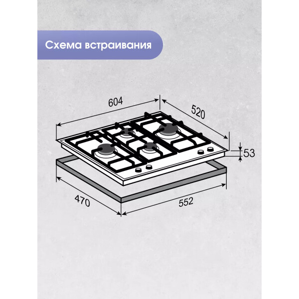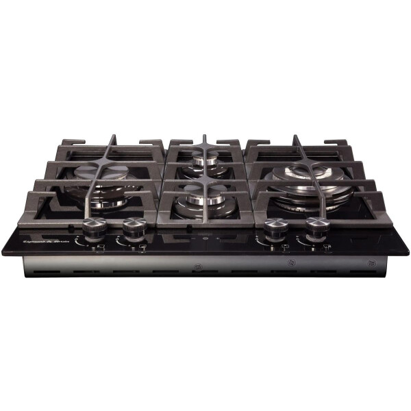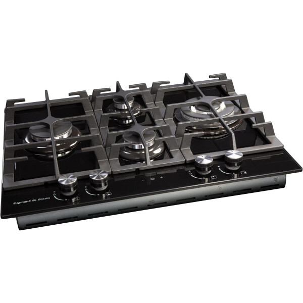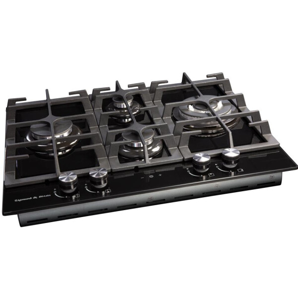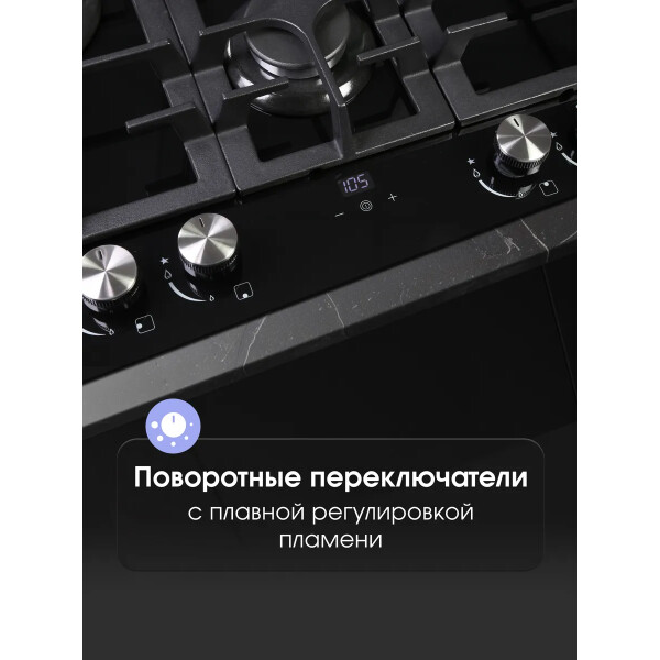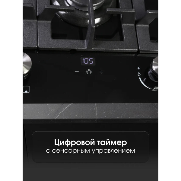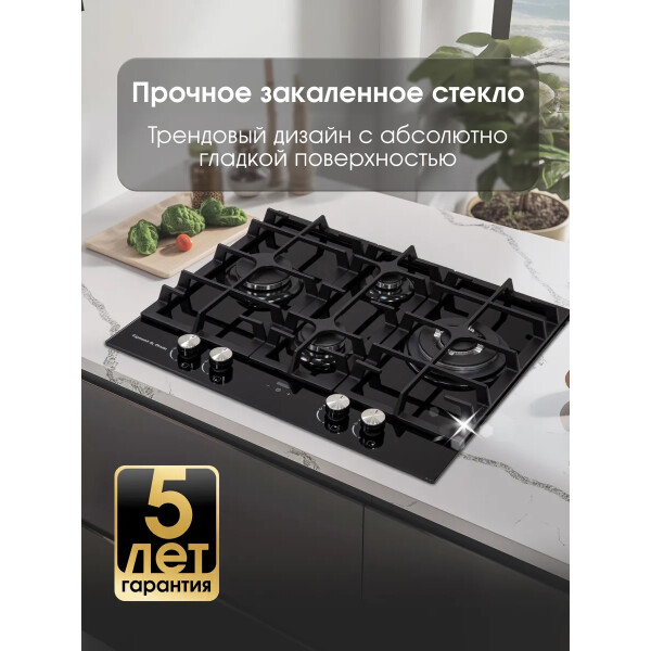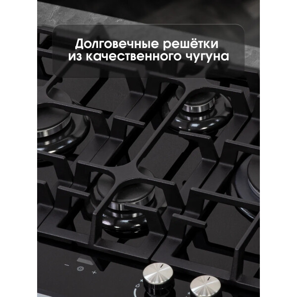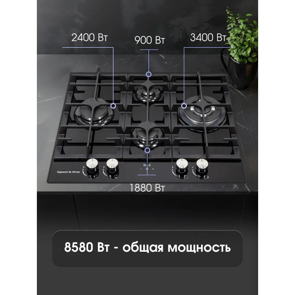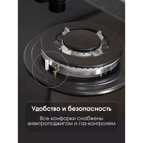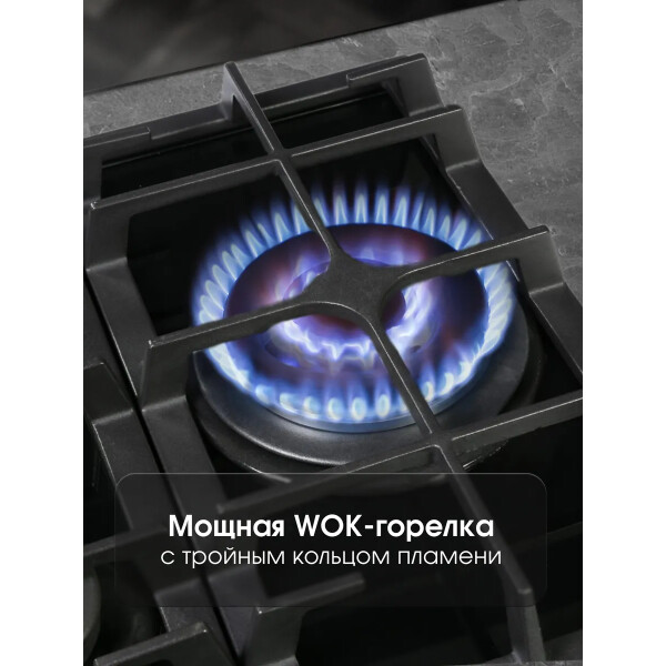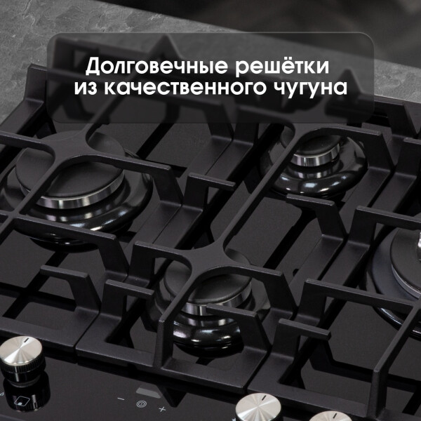 Панель оснащена 4 конфорками разного уровня мощности: 950; 1880; 2100 и 3400 Вт. Есть турбо-горелка тройное кольцо, газ-контроль и таймер. В комплекте идут матовые колпачки горелок, переходники для разных типов газа.