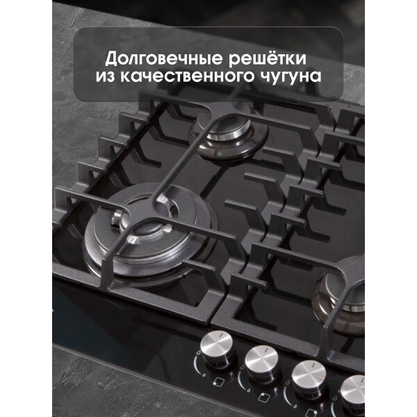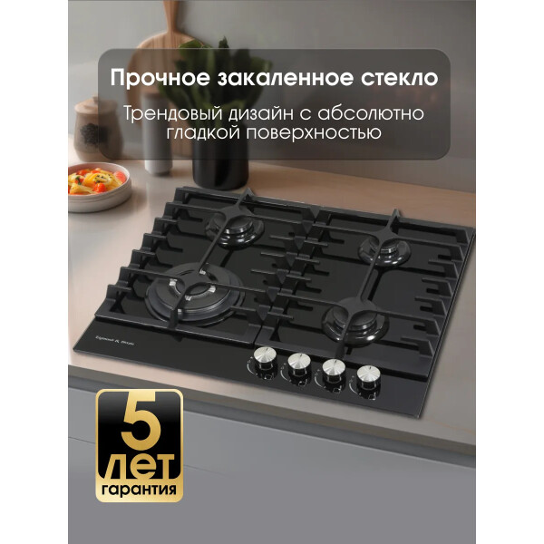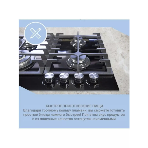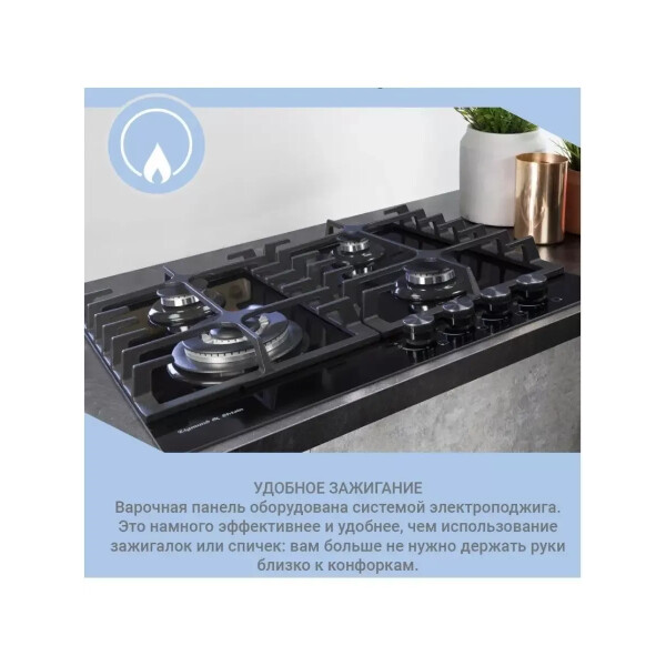 В ней продумано все до мельчайших деталей. Максимальное удобство и безопасность обеспечивают устойчивые чугунные решетки и система газ-контроль, интегрированная в конфорки. Фронтальное управление горелками удобно, а внешний вид панели исполненный в черном цвете будет достойным украшением Вашей кухни. Электроподжиг расположен в переключателях управления. Система газ-контроль останавливает подачу газа в случае прекращения горения пламени конфорки. Конфорка с тремя кольцами пламени (тройная корона) - эксклюзивная и самая мощная. Благодаря одновременному использованию нескольких рядов пламени гарантируется наиболее эффективное распределение огня под посудой и равномерное прожаривание блюд. С этой конфоркой время приготовления сводится к минимуму, а результат, который Вы получите, будет действительно оптимальный.