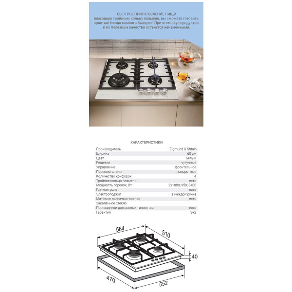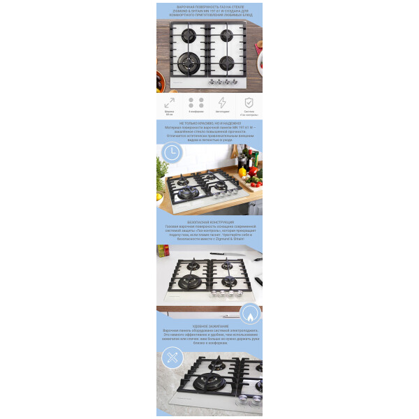 Встраиваемая газовая варочная панель Zigmund & Shtain MN 197.61 W предназначена для приготовления и разогрева различных блюд.