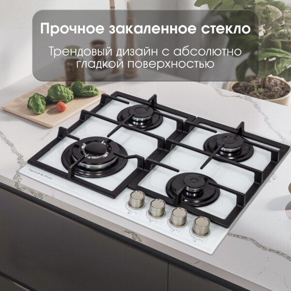 Встраиваемая газовая варочная панель Zigmund & Shtain MN 199.61 W - это газ на стекле, причем стекло закаленное и ударопрочное. Чугунная решетка обеспечит максимальную устойчивость посуды, а система газ-контроль позаботиться о Вашей безопасности, если пламя случайно погаснет. Мощность горелок Вт: 1 горелка 3.800 Вт, 2 горелки 1.750 Вт, 1 горелка 900 Вт.