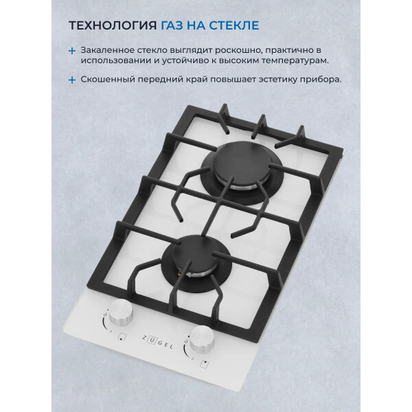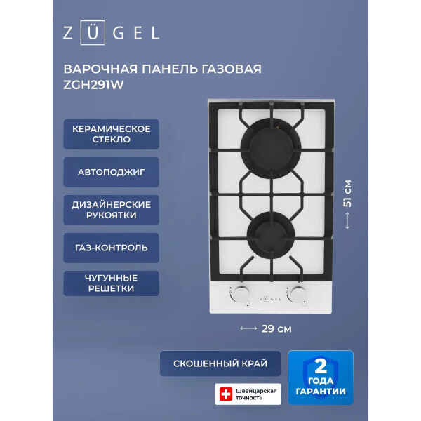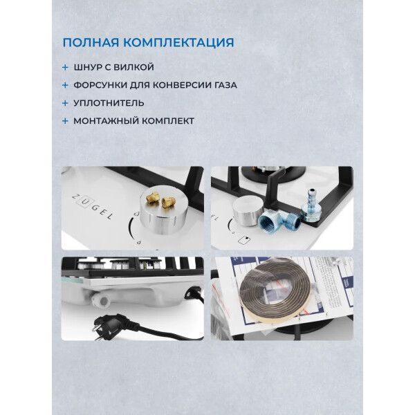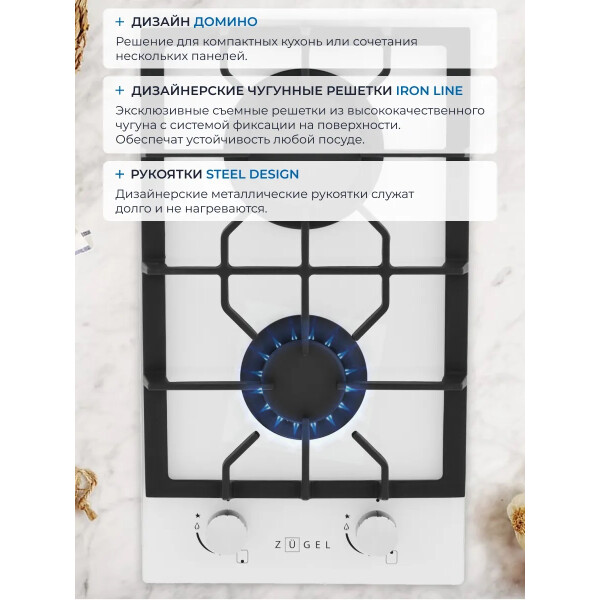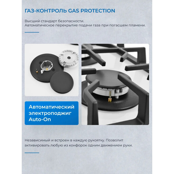 Газ-контроль автоматически отключает подачу газа, если пламя случайно погасло. Конструкция чугунных решеток удобна для размещения посуды любого размера