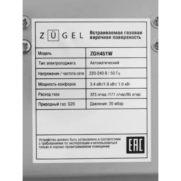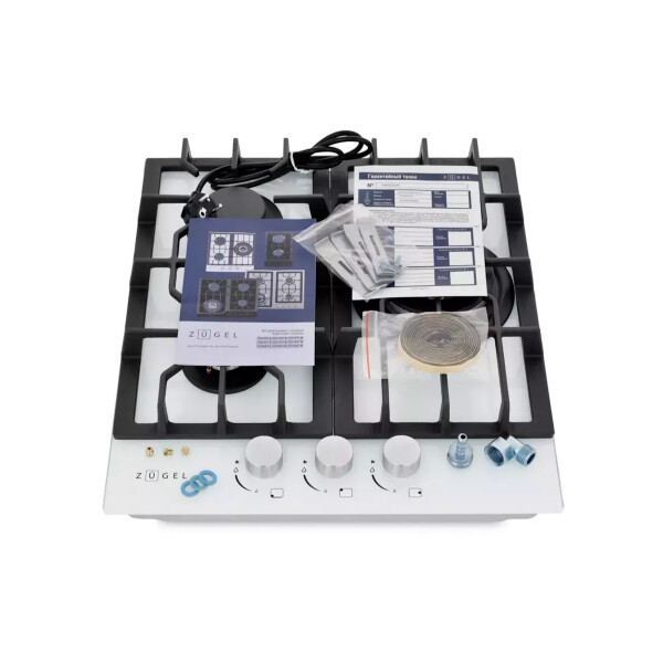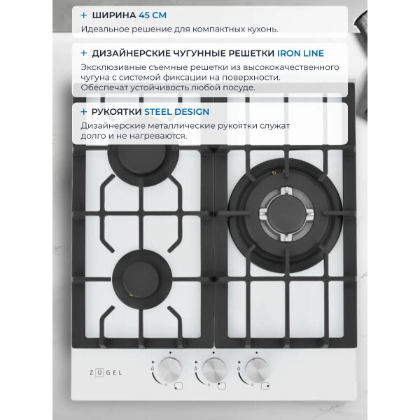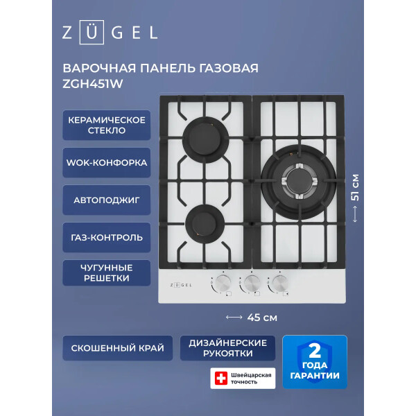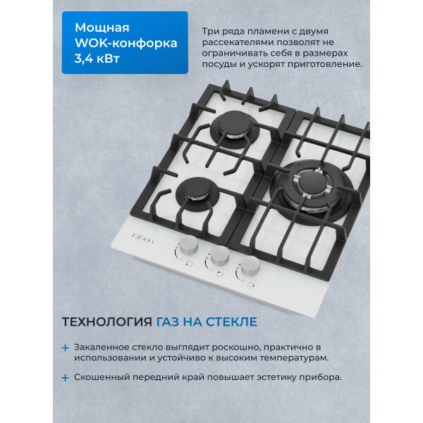 Варочная панель ZUGEL ZGH451W, оснащённая системой Газ-контроль и мощной WOK-конфоркой, создающей сразу 3 независимых контура пламени - это наиболее современная и функциональная модель ZUGEL, исполненная в белом закалённом стекле.