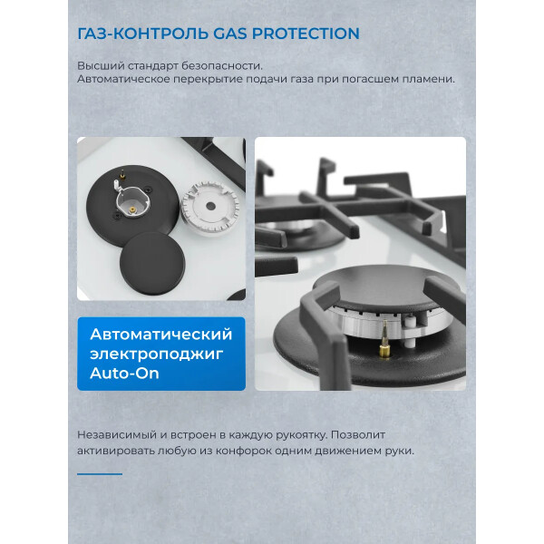 Автоматический электроподжиг, независимо встроенный в каждую из рукояток, позволит зажечь любую конфорку за долю секунды, всего одним нажатием и поворотом руки, не прибегая к дополнительным приспособлениям.