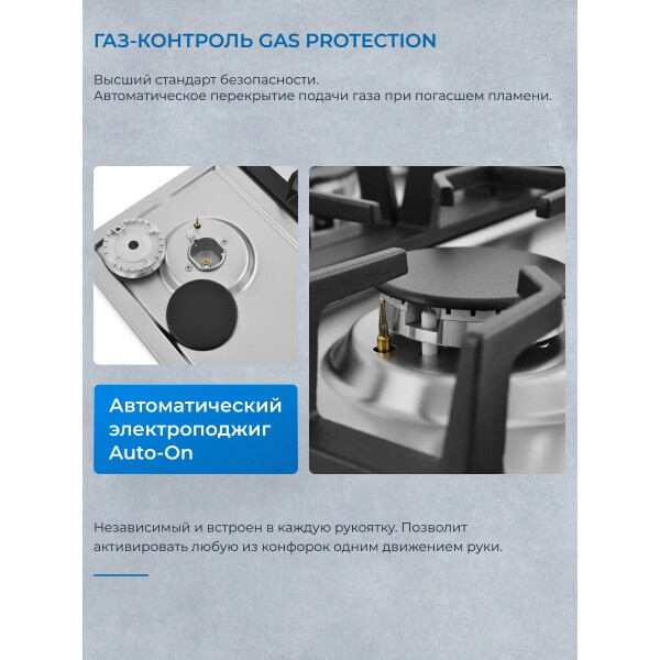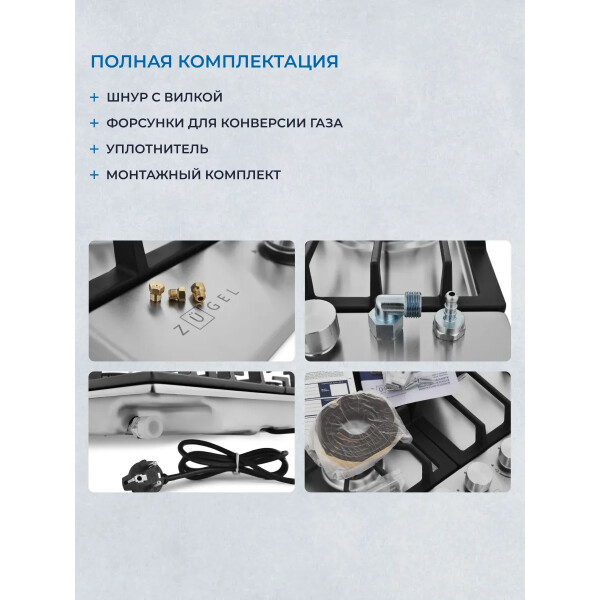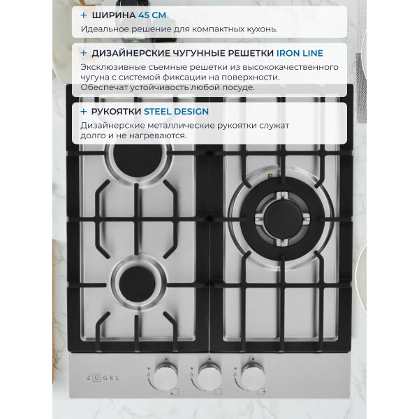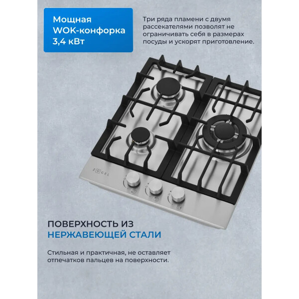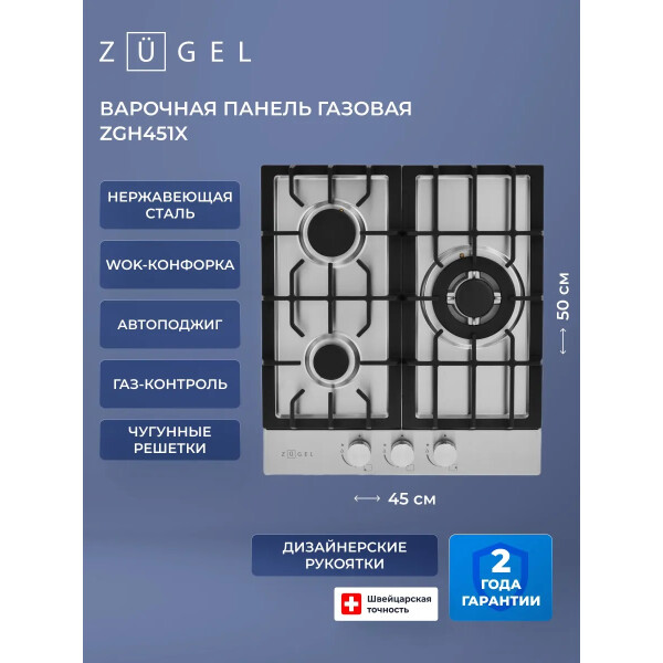 Варочная панель ZUGEL ZGH451X, оснащённая системой Газ-контроль и мощной WOK-конфоркой, создающей сразу 3 независимых контура пламени - это наиболее современная и функциональная модель ZUGEL, исполненная из нержавеющей стали.