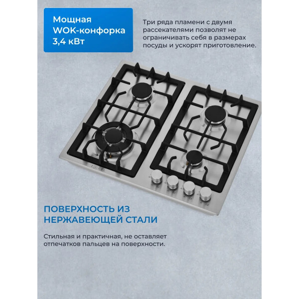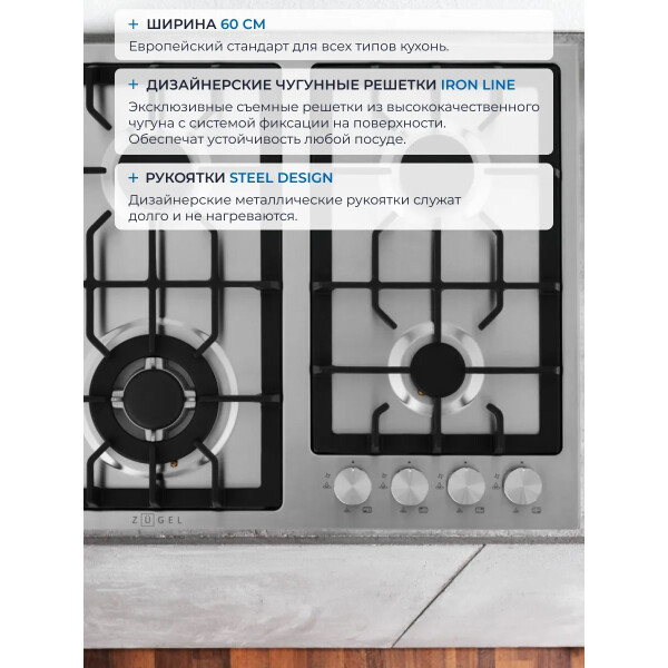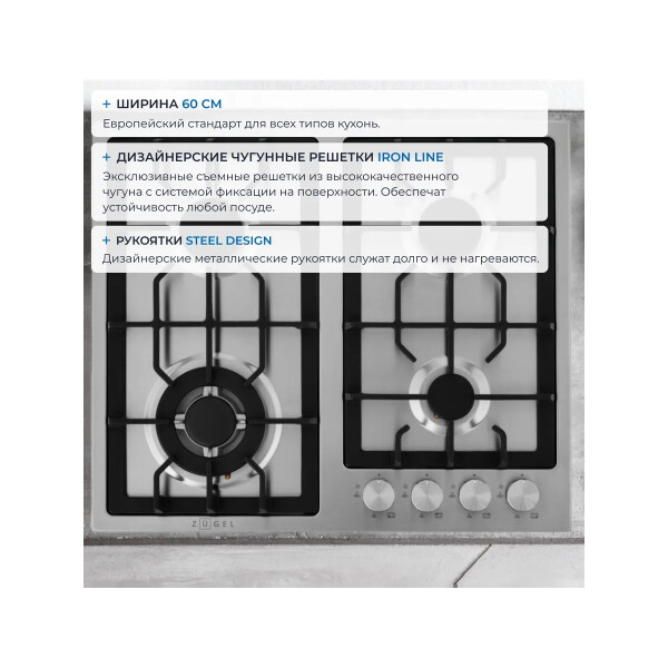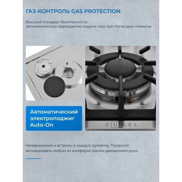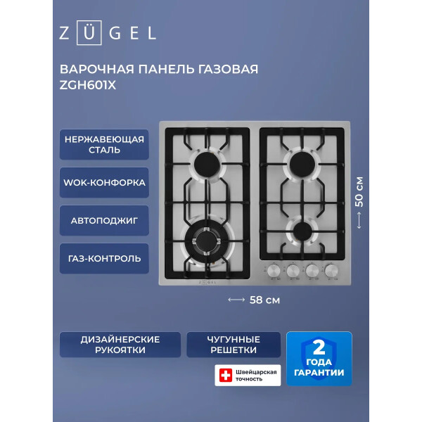 Варочная панель ZUGEL ZGH601X, оснащённая системой Газ-контроль и мощной WOK-конфоркой, создающей сразу 3 независимых контура пламени - это наиболее современная и функциональная модель ZUGEL, исполненная из нержавеющей стали.