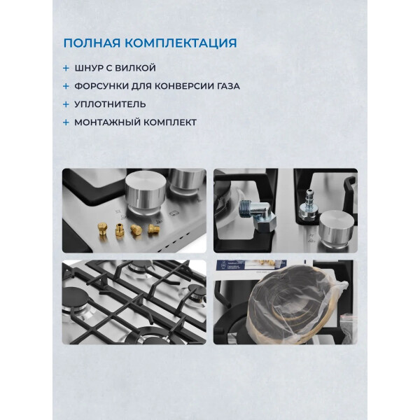 Газ-контроль каждой конфорки обеспечивает наивысшую безопасность: в случае, если пламя погасло, подача газа будет автоматически прекращена;