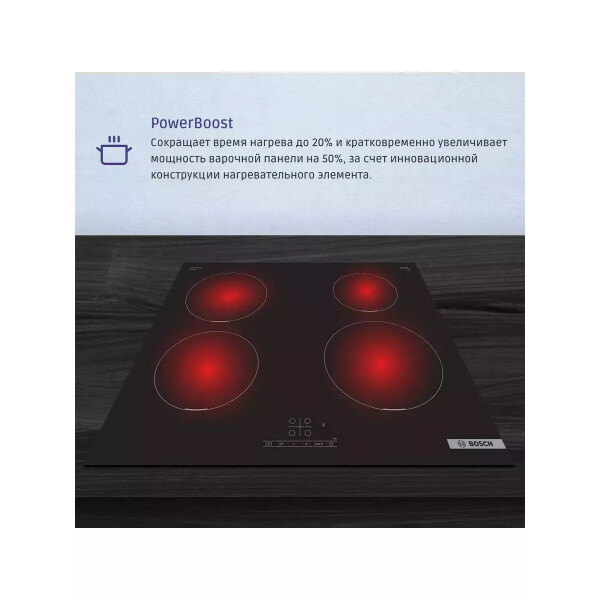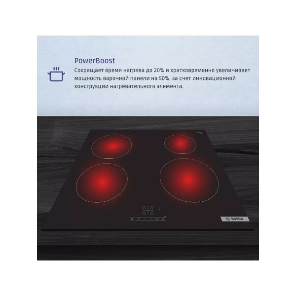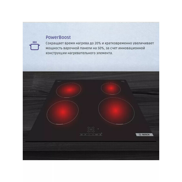 PowerBoost на индукционной варочной панели сокращает время нагрева до 20% и кратковременно увеличивает мощность варочной панели на 50% больше мощности. Технологически это выполняется за счет инновационной конструкции нагревательного элемента с дополнительным витком спирали.