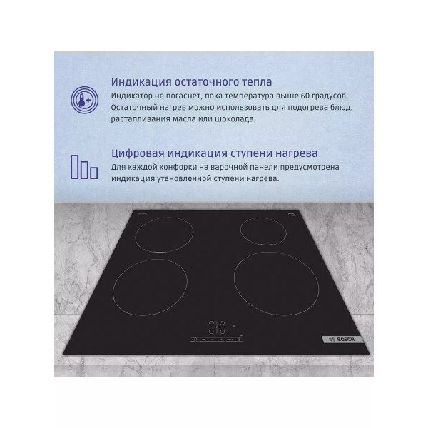 Варочная панель Bosch PUE 611 BB5E представлена в черном цвете. Навигация осуществляется через сенсорную панель TouchSelect. ReStart сохранит все настройки от случайного выключения. Функция Блокировка от детей поможет от случайного включения. Главный выключатель позволит отключить все конфорки одновременно.