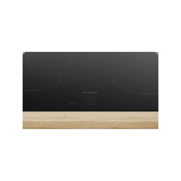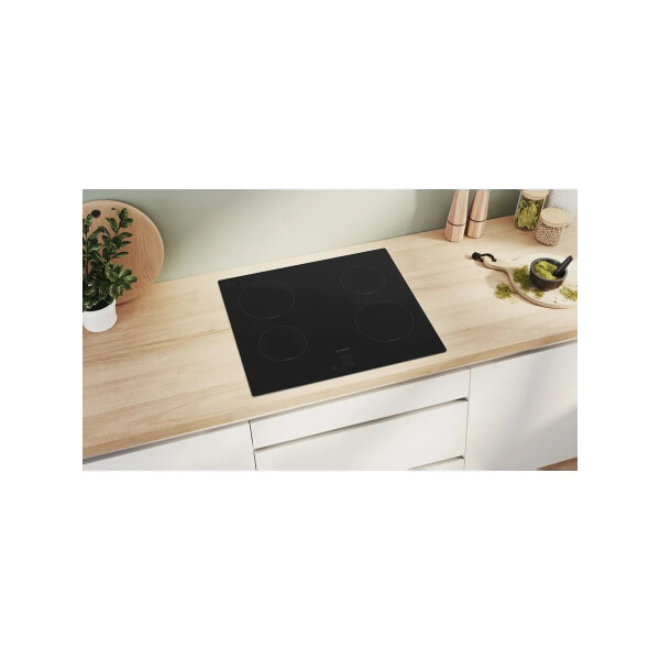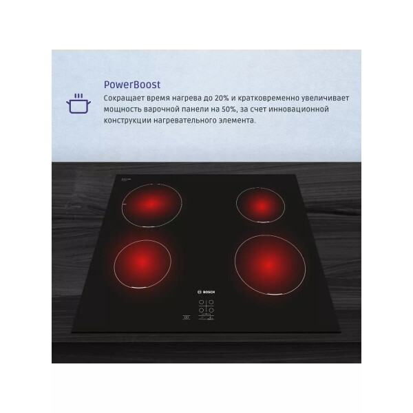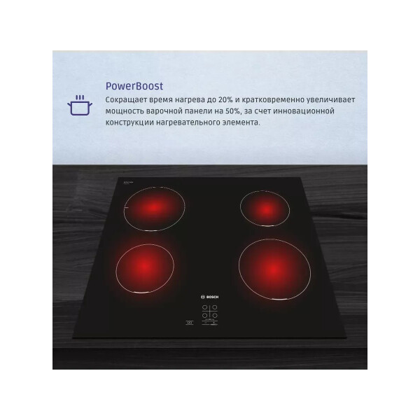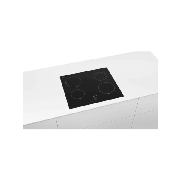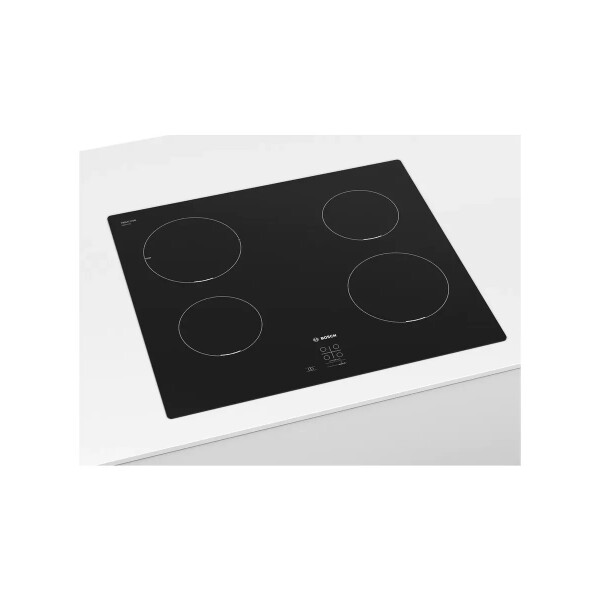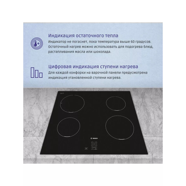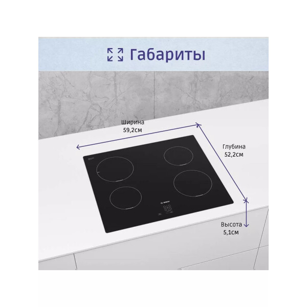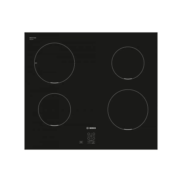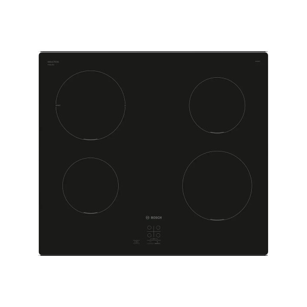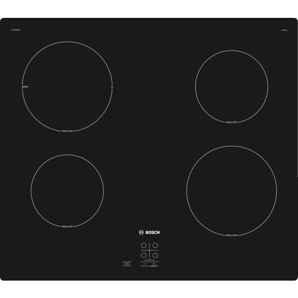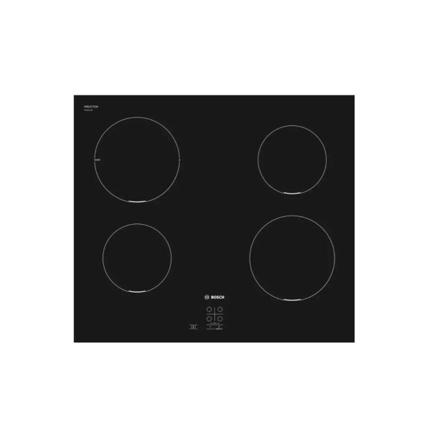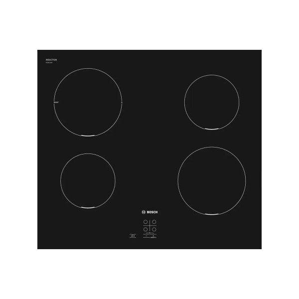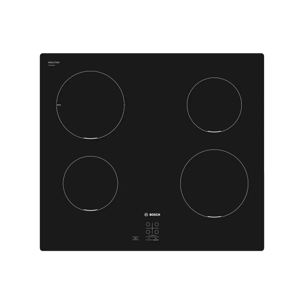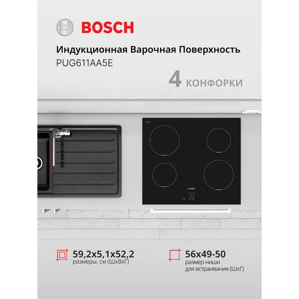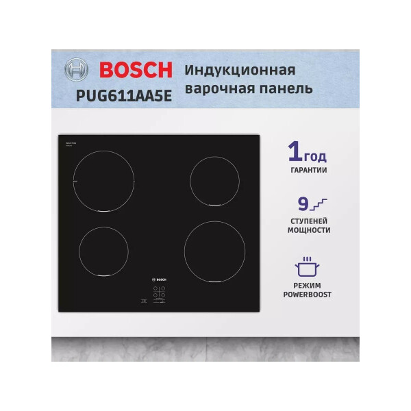 Независимая индукционная панель Bosch PUG 611AA5E из стеклокерамики черного цвета оснащена четырьмя конфорками разного диаметра.