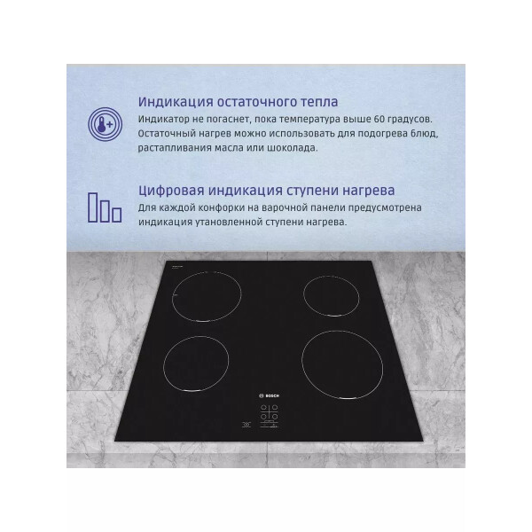 Индикаторы показывают остаточное тепло, отсутствие посуды, время приготовления, мощность.