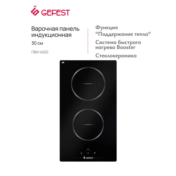В модели Gefest ПВИ 4000 предусмотрены 2 независимые конфорки, мощность каждой из которых регулируется при помощи сенсорных элементов. Дополнительным плюсом домашней помощницы станет автоматика закипания и технология защитного отключения. Встроенный таймер в автоматическом режиме приостановит нагрев конфорок, тем самым избавив от необходимости постоянно контролировать ход кулинарного процесса. Рабочая поверхность выполнена с использованием стеклокерамики материала, очистку которого от накопившихся загрязнений вы сможете произвести без лишних усилий.