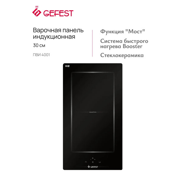 Индикатор остаточного тепла показывает, когда конфорки остыли окончательно. Овальная зона нагрева весьма удобна, когда вы готовите в большой по диаметру посуде или в посуде продолговатой формы, например, в утятнице. Gefest ПВИ 4001 весьма проста и удобна в управлении благодаря сенсорной панели. А защитное отключение конфорок гарант безопасного использования поверхности и ее долгого срока службы.