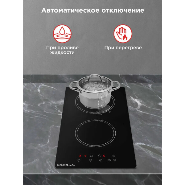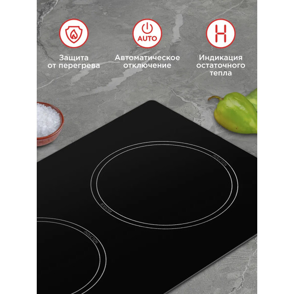 Защитное автоотключение обеспечивает самостоятельное отключение конфорки в случае перегрева или попадания воды, это гарантирует высокую степень безопасности для вас и вашего дома.