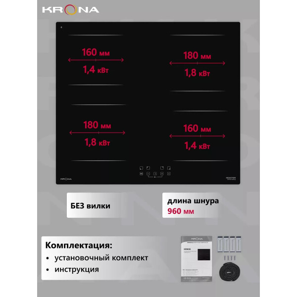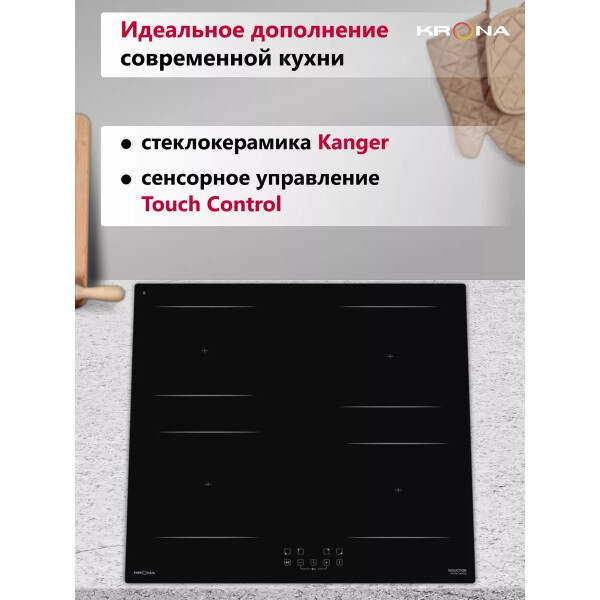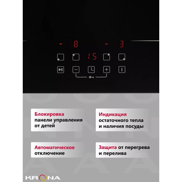 Для безопасной эксплуатации варочной панели предусмотрена блокировка управления, защита от перелива и перегрева, а также датчик автоматического определения посуды, благодаря которому нагрев зоны не начнется, если на ней нет подходящей посуды.