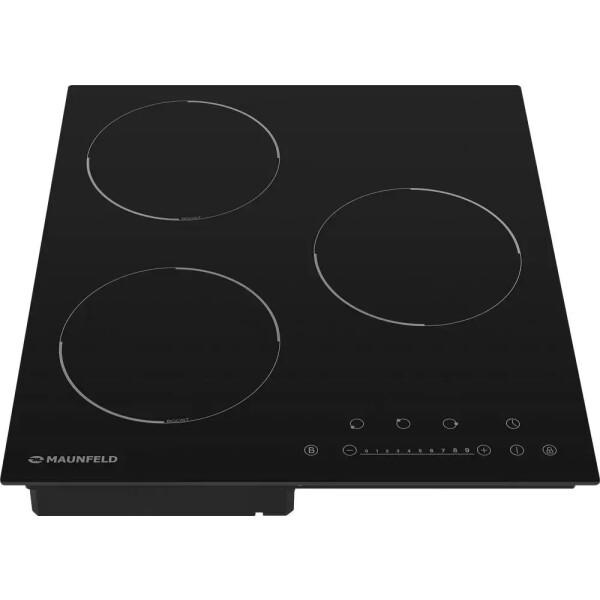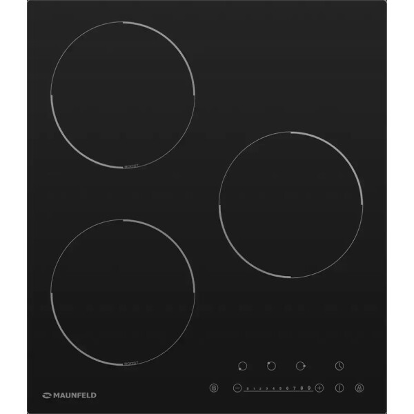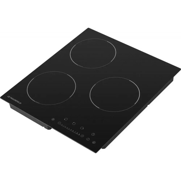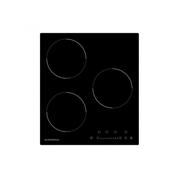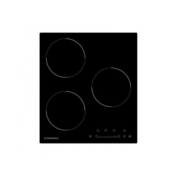 Maunfeld EVI 453-BK это электрическая варочная панель с тремя индукционными конфорками. Материал поверхности закалённое стекло чёрного цвета. Управление сенсорное. Есть функции защиты от детей и блокировки всех элементов в случае мокрой поверхности.