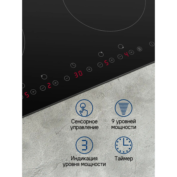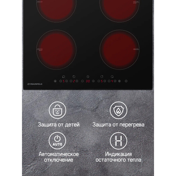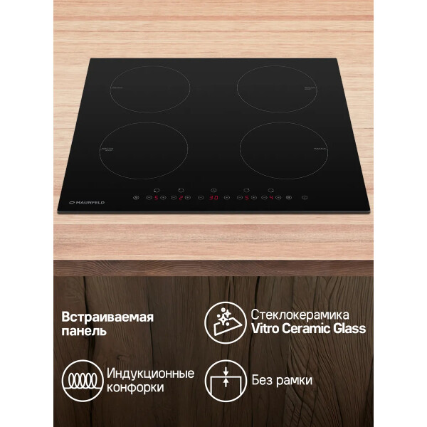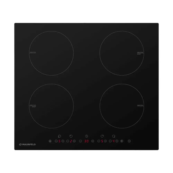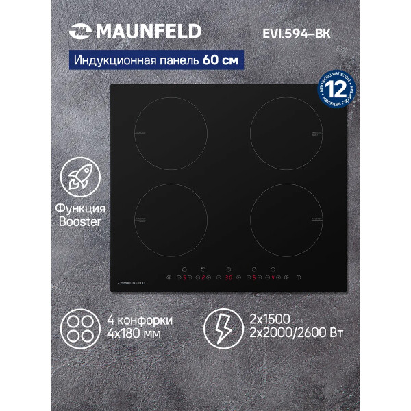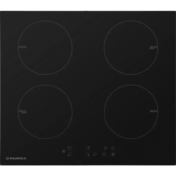 Maunfeld EVI.594-BK это индукционная варочная панель изстеклокерамики чёрного цвета. Имеет четыре симметрично расположенных конфорки, втом числе два бустера. Предусмотрена защита отдетей, атакже автоматическое отключение иблокировка всех элементов вслучае мокрой поверхности. Управление сенсорное.