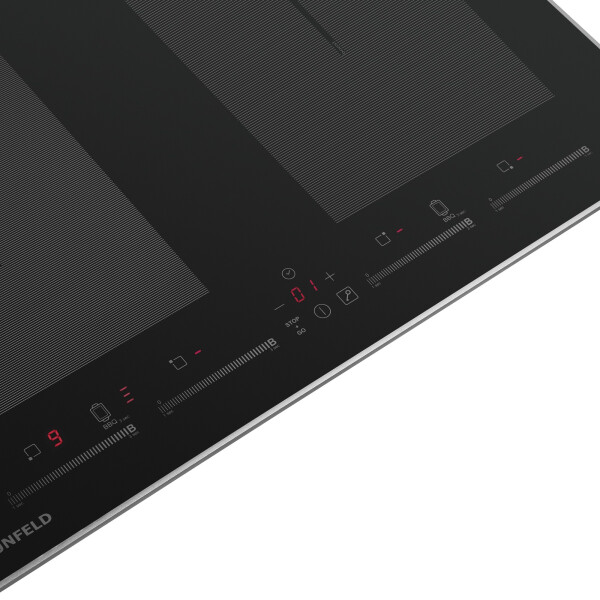 Индикация ступени нагрева (от 0 до 9), функция барбекю, таймер приготовления, таймер минутный, детектор диаметра посуды, индикатор остаточного тепла, замок от детей, блокировка всех элементов в случае мокрой поверхности, автоматическое отключение, бустеры (разгонный блок) для каждого индукционного элемента в отдельности и для мостов в целом.