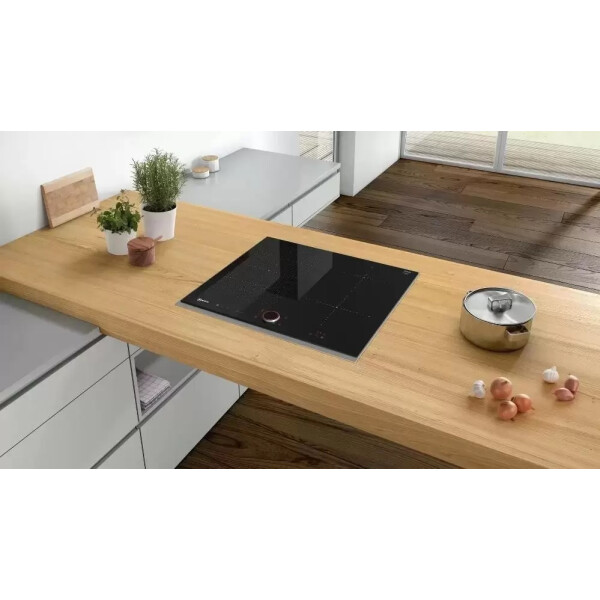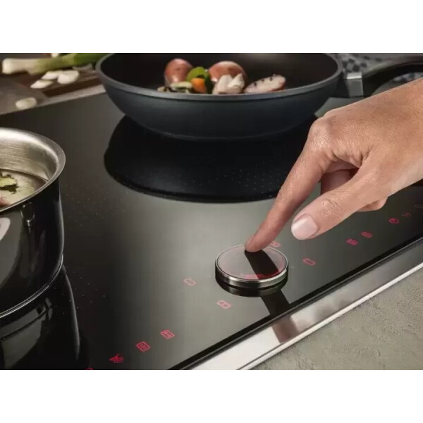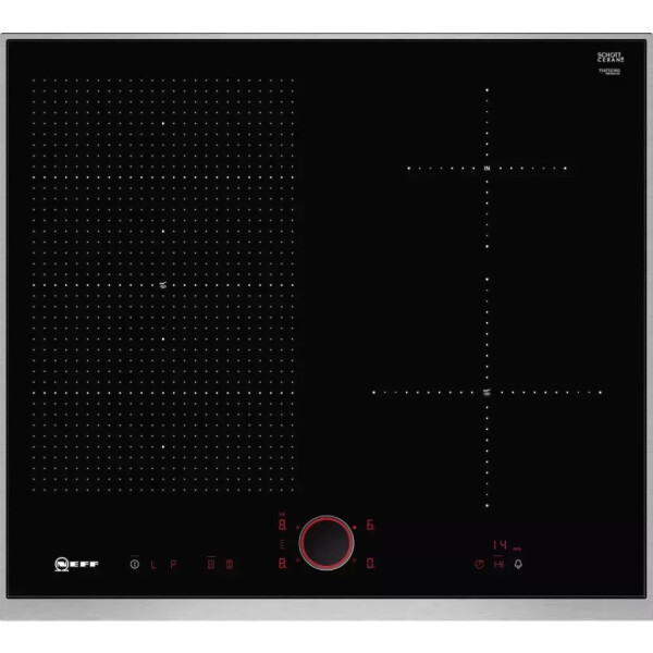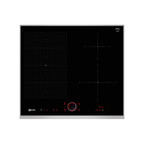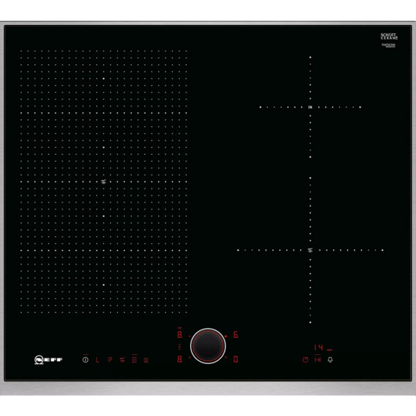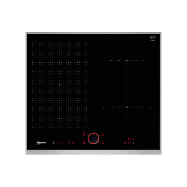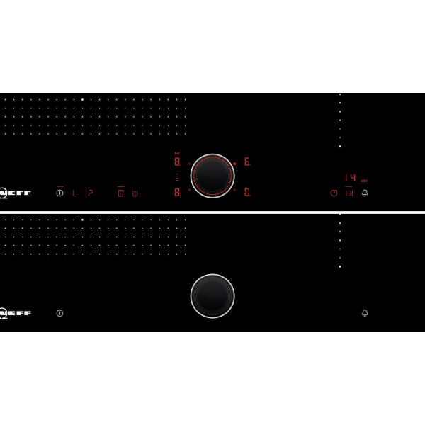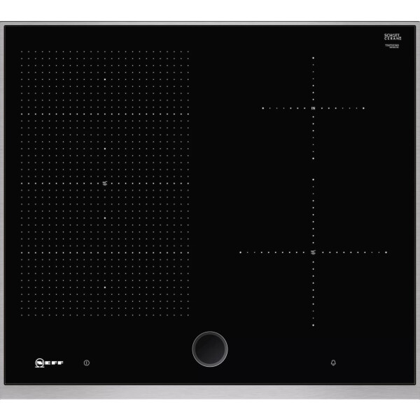 У Индукционной варочной панели NEFF T56TS51N0 на поверхности условно обозначена граница для автоматического обнаружения утвари, ориентированная на конкретный диаметр. Когда поверхность замечает ферромагнитное дно, она активирует конкретный участок для нагрева. Двухступенчатая индикация остаточного тепла с индикацией H указывает, что конфорку можно использовать для разогрева уже готовой пищи, а знак h означает, что плита ещё не до конца остыла.