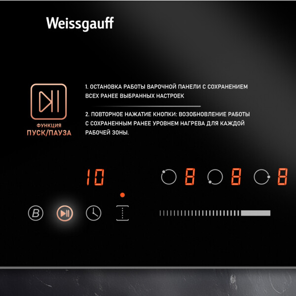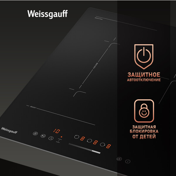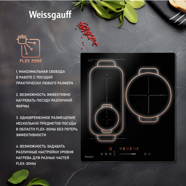 Варочная панель Weissgauff HI 430 BFZ оснащена свободной зоной Flex Zone, что позволяет готовить в посуде нестандартной формы или размера. Благодаря индукционной технологии нагрева, при которой повышение температуры происходит непосредственно в дне самой посуды, еда готовится гораздо быстрее, расходуется меньше электроэнергии, а убежавшая еда не пригорит к поверхности: ведь сама она не раскаляется.