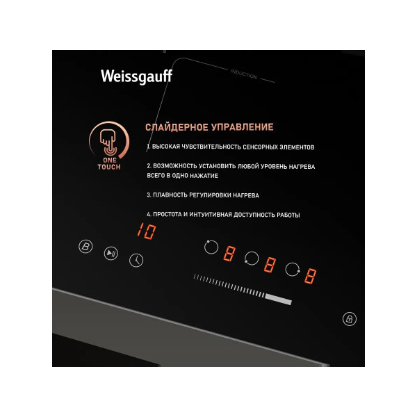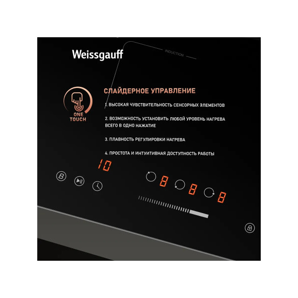 Блок управления-слайдер, позволяющий всего в одно касание выставить необходимый вам уровень нагрева любой из конфорок и делающий процесс управления панелью значительно более быстрым и легким.