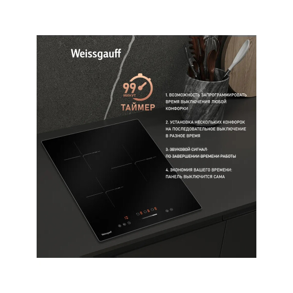Таймер до 99 минут дает вам возможность запрограммировать время выключения любой конфорки, с точностью до минуты