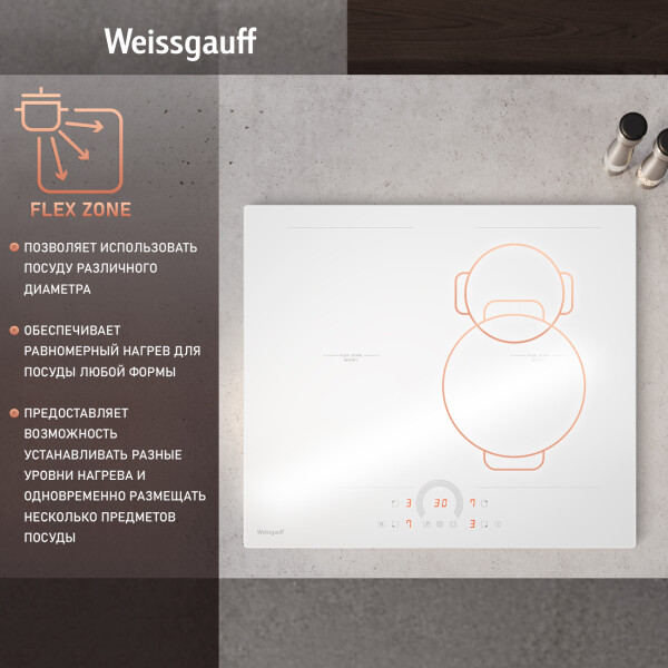 Это иновационный дизайн индукционных конфорок, обеспечивающий максимальную свободу в процессе приготовления пищи для использования посуды любого размера.
