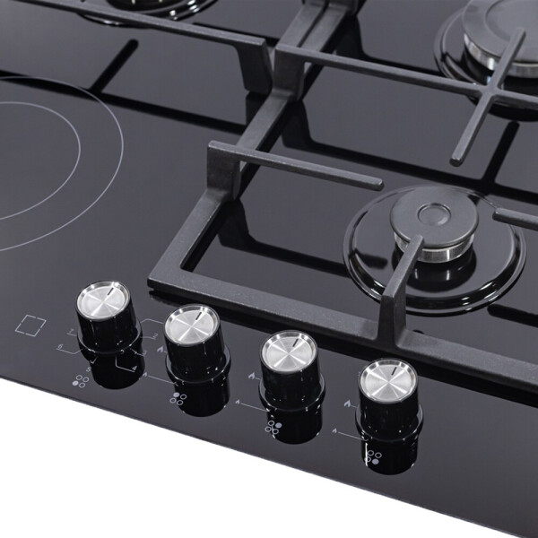 Комбинированная варочная панель Simfer H60H32S512 , оснащенная тремя газовыми и одной электрической конфорками - настоящая находка для любящих эксперименты людей, так как комбинирование источников тепла предоставляет довольно обширные возможности для всех хозяек, которые вынуждены или любят много готовить. Благодаря небольшим размерам и лаконичному дизайну эта модель впишется в интерьер любой кухни. Материал рабочей поверхности - жаростойкое закаленное стекло, которое имеет красивый зеркальный вид.Управление варочной панелью осуществляется посредством четырёх поворотных переключателей, в которые встроен электроподжиг, значительно упрощающий работу с панелью. Для управления электроконфоркой встроен сенсорный пульт в поверхность и регулятор мощности. Мощность конфорок: 1 х большая конфорка газовая - 3000 Вт. 1 х стандартная конфорка газовая - 1750 Вт. 1 x экономичная конфорка газовая - 1000 Вт. Мощность электроконфорки - двойное расширение 700/1700. Материал решеток - чугун Дополнительным достоинством варочной поверхности является наличие функции газ-контроль конфорок, отключающей подачу газа при затухании пламени. Комбинированная варочная панель Simfer стильный и функциональный прибор, который поможет вам готовить самые разнообразные блюда!