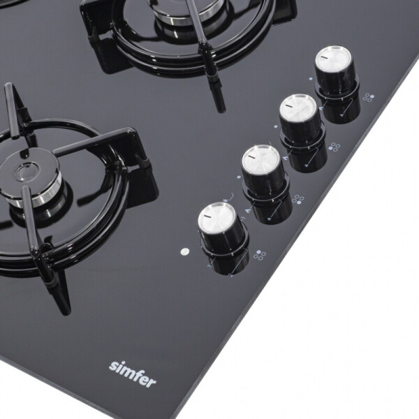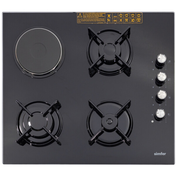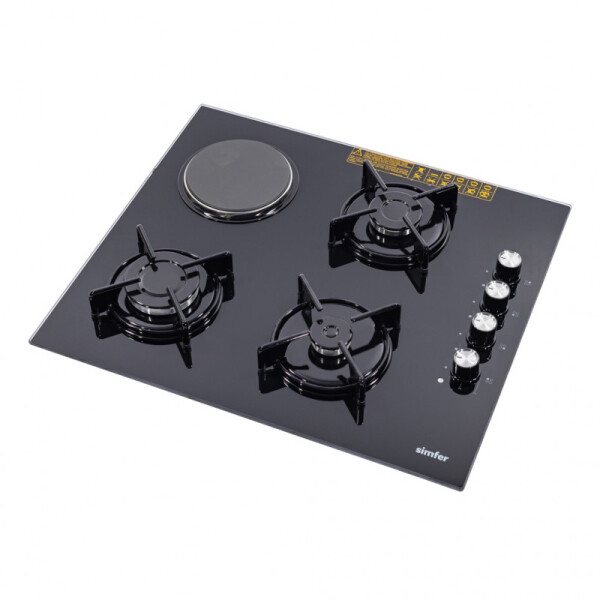 Комбинированная варочная панель Simfer H60K32B511 , оснащенная тремя газовыми и одной электрической конфорками - настоящая находка для любящих эксперименты людей, так как комбинирование источников тепла предоставляет довольно обширные возможности для всех хозяек, которые вынуждены или любят много готовить. Благодаря небольшим размерам и лаконичному дизайну эта модель впишется в интерьер любой кухни. Материал рабочей поверхности - жаростойкое закаленное стекло, которое имеет красивый зеркальный вид.Управление варочной панелью осуществляется посредством четырёх поворотных переключателей, в которые встроен электроподжиг, значительно упрощающий работу с панелью.
