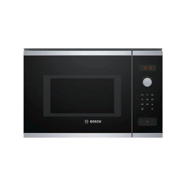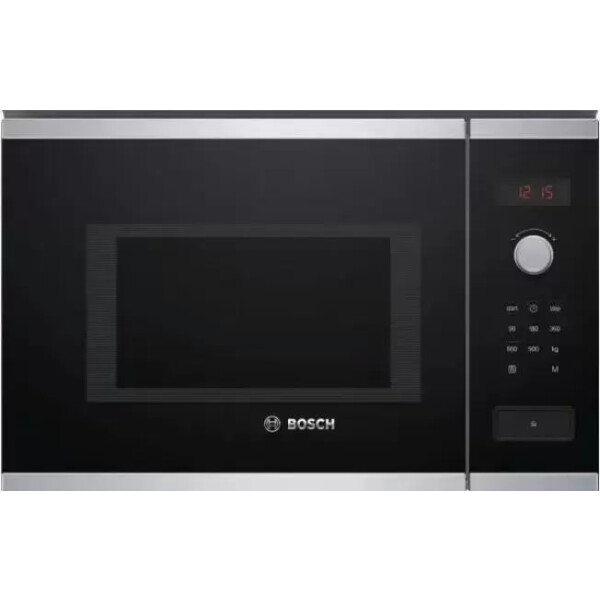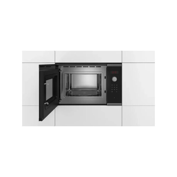 Встраиваемая микроволновая печь BOSCH BFL553MS0 представлена в черном цвете с серебристыми вставками.
