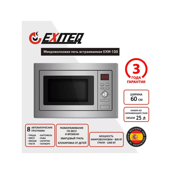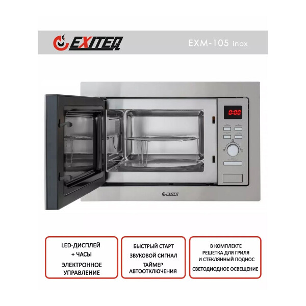 Exiteq EXM-105 это недорогая и функциональная микроволновая печь. Модель оснащена грилем кварцевого типа. Особый режим микроволны + гриль существенно сократит время приготовления пищи. Покрытие из нержавеющей стали отличается прочностью и долговечностью. Его легко содержать в чистоте: достаточно протирать влажной губкой после сеанса готовки.