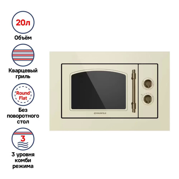 Встраиваемая микроволновая печь Maunfeld JBMO.20.5ERIB с возможностью монтажа в навесной шкаф евростандарта глубиной в 32 см, имеет большой объем в 20 литров с внутренним покрытием камеры из нержавеющей стали и кварцевый гриль, который набирает рабочую мощность быстрее обычных и занимает меньше места внутри.