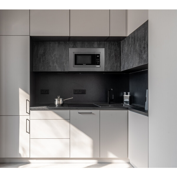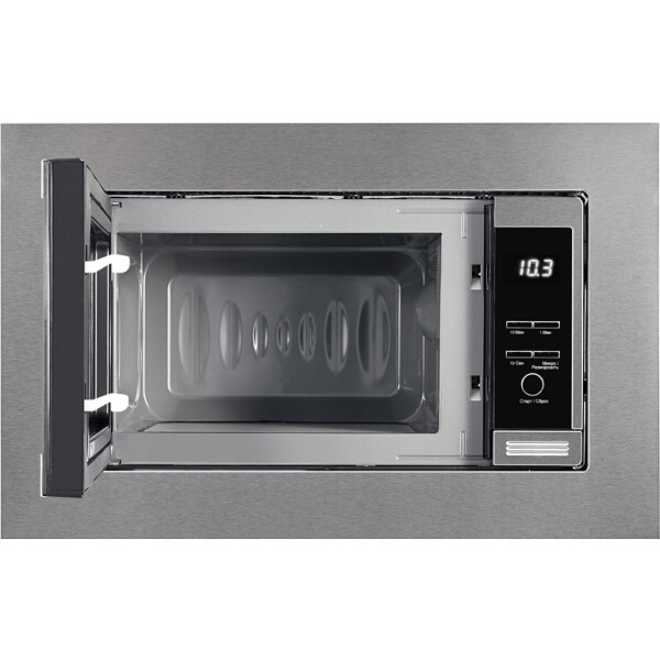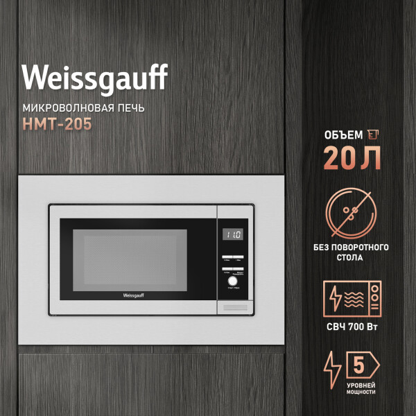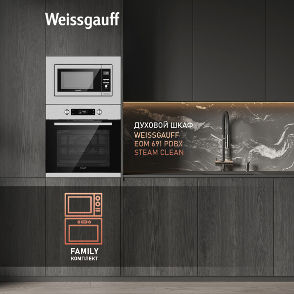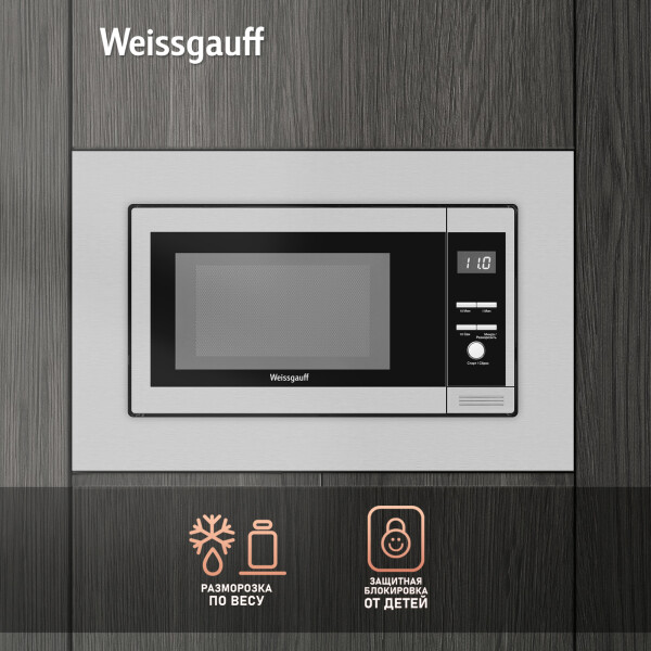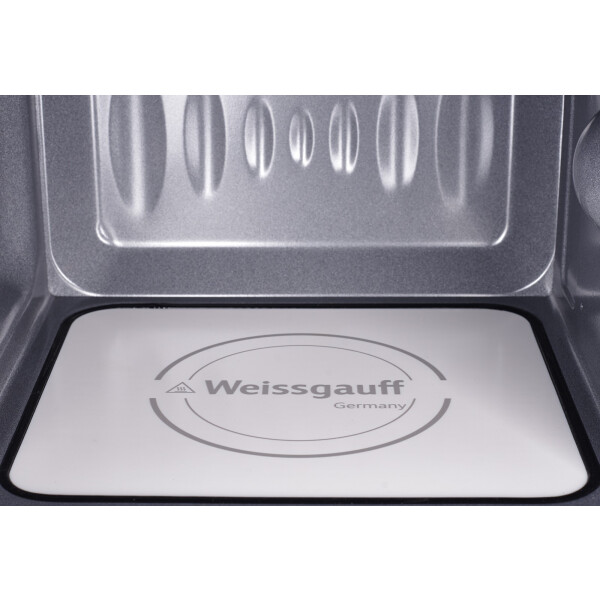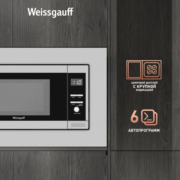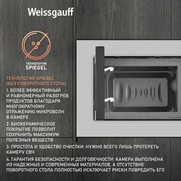 Встраиваемая микроволновая печь Weissgauff в цвете нержавеющая сталь равномерно разогревает еду без поворотного стола, благодаря системе Spiegel и биокерамическому покрытию White Flat Ceramic.