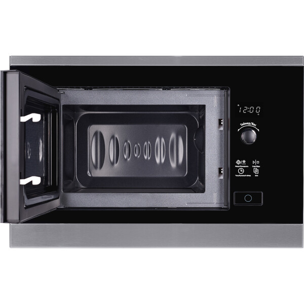Встраиваемая микроволновая печь Weissgauff в чёрном цвете с элегантными серебристыми панелями из нержавеющей стали равномерно разогревает еду без поворотного стола, благодаря системе Spiegel и биокерамическому покрытию White Flat Ceramic.