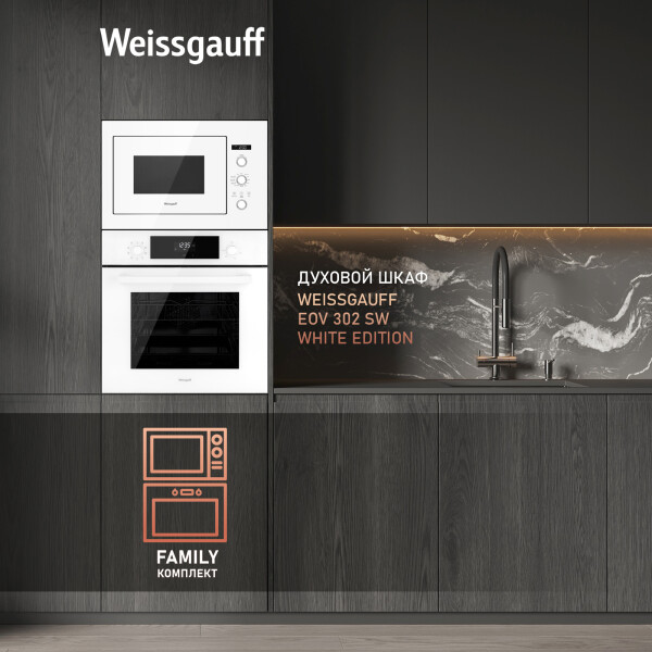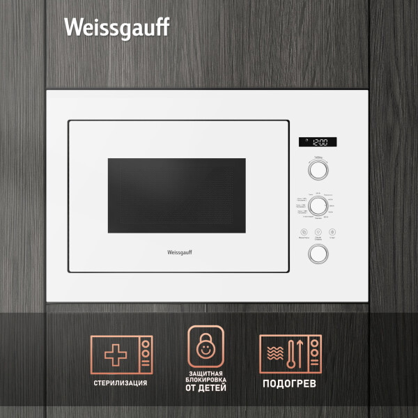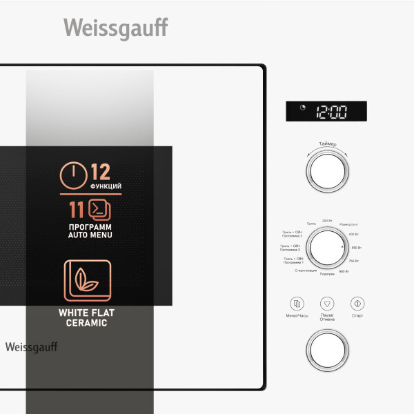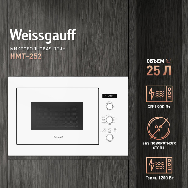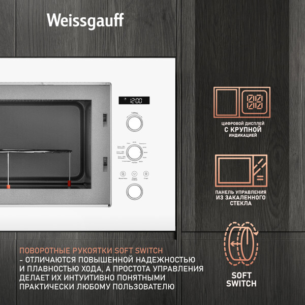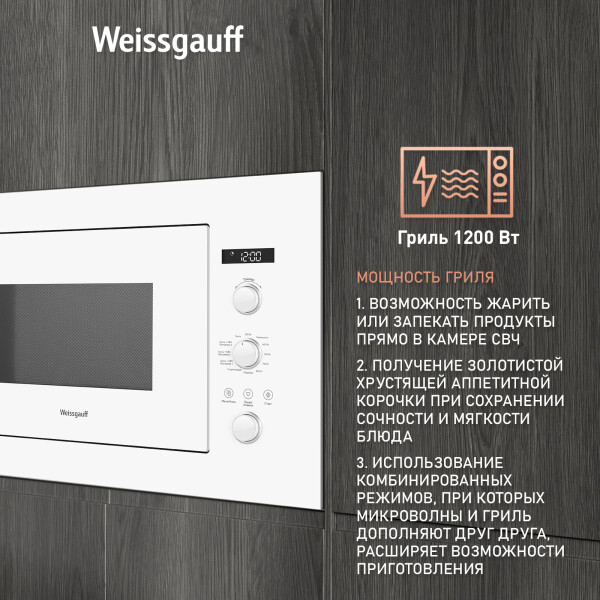 Встраиваемая микроволновая печь Weissgauff HMT-252 в белом цвете равномерно разогревает еду без поворотного стола, благодаря системе Spiegel и биокерамическому покрытию White Flat Ceramic.