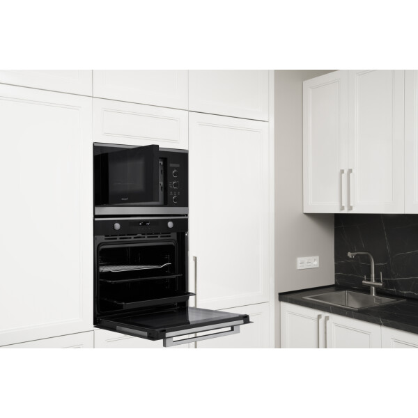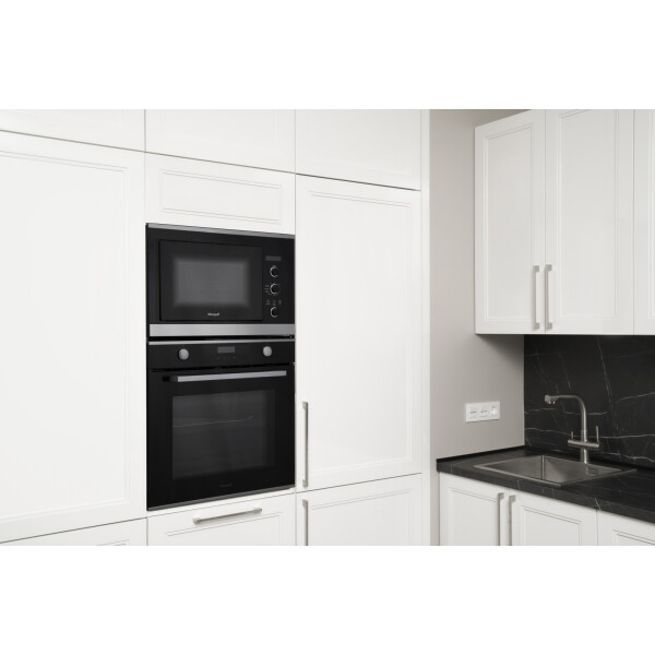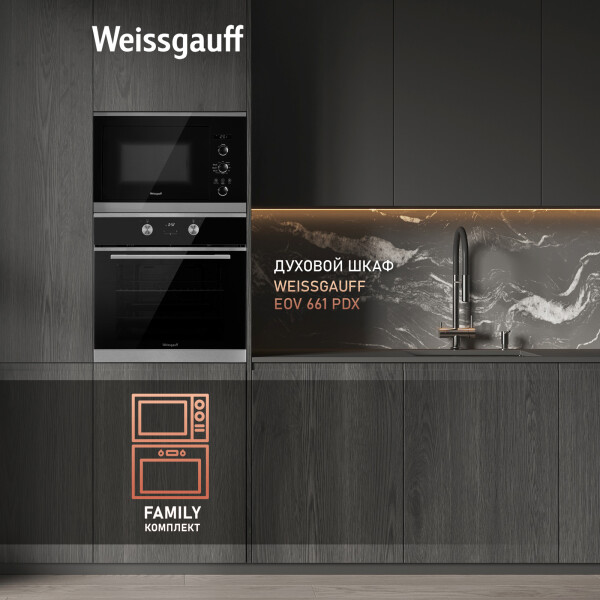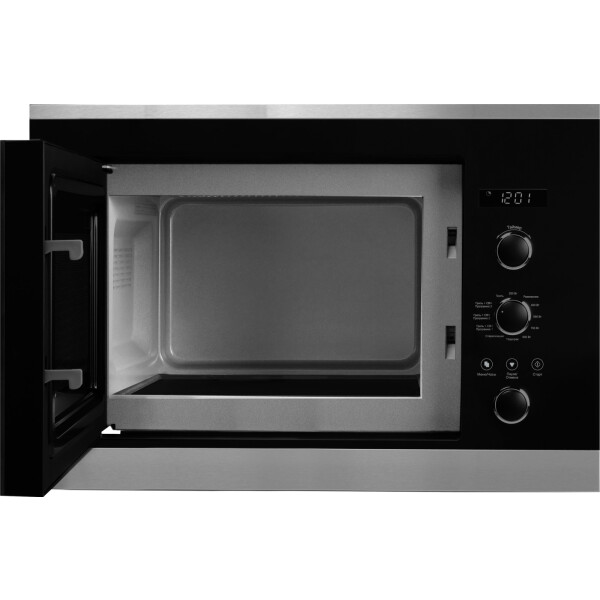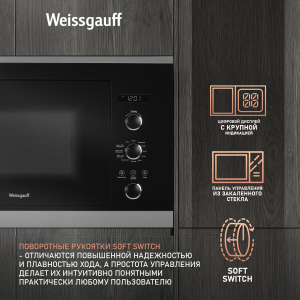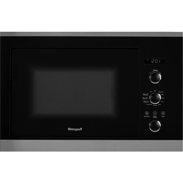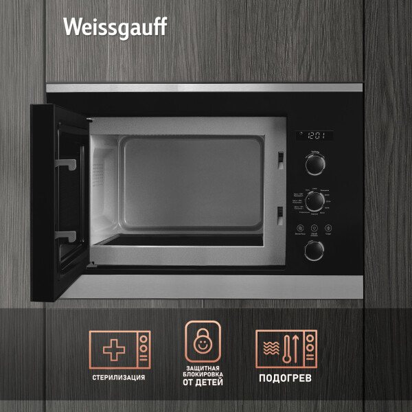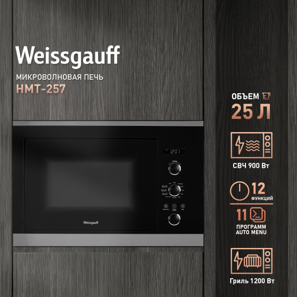 Встраиваемая микроволновая печь Weissgauff HMT-257 в привлекательном серебристом цвете, равномерно разогревает еду без поворотного стола, благодаря системе Spiegel и биокерамическому покрытию.