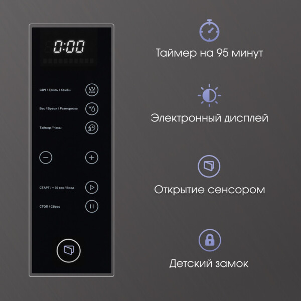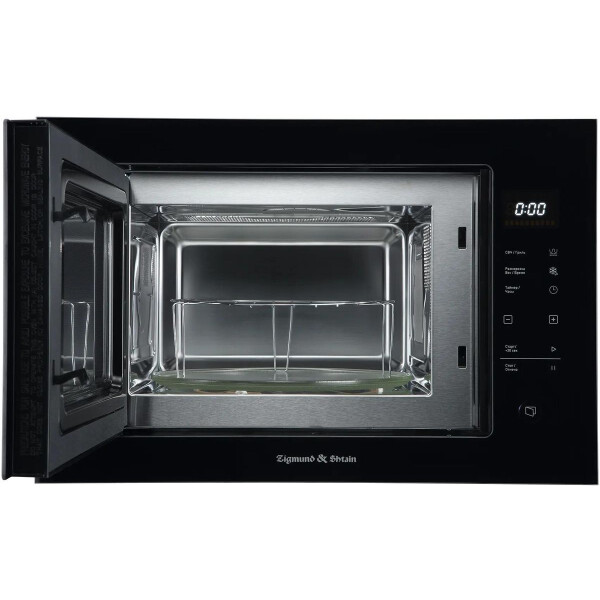 Открывание дверцы происходит с помощью сенсорной кнопки, которая позволяет открыть доступ к камере без особых усилий. С помощью дисплея и кнопок можно задать режим и время работы микроволновой печи. Имеются такая функции, как блокировка от детей и разморозка продуктов. Подсветка камеры микроволновой печи Zigmund & Shtain BMO 15.252 B позволит без лишних хлопот проверить готовность блюда визуально.