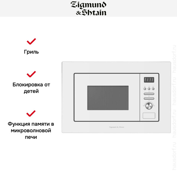 Zigmund & Shtain BMO 16.202 W белого цвета дополнит любой интерьер, а также быстро войдет в обиход, позволяя сэкономить большое количество времени. Мощность микроволн этой модели - 800 Вт. Присутствует функция гриля. Объем внутренней камеры составляет 20 литров, что делает эту СВЧ-печь хорошей альтернативой стандартной газовой или электрической духовке.