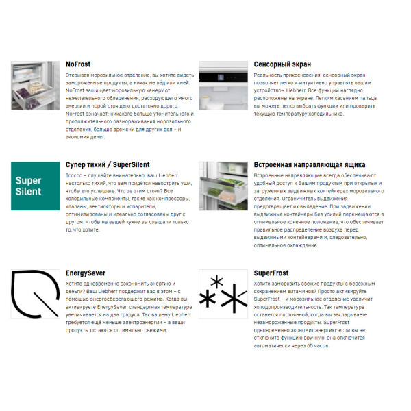 NoFrost защищает морозильную камеру от нежелательного обледенения, расходующего много энергии. NoFrost означает: никакого больше утомительного и продолжительного размораживания морозильного отделения, больше времени для других дел и экономия денег.