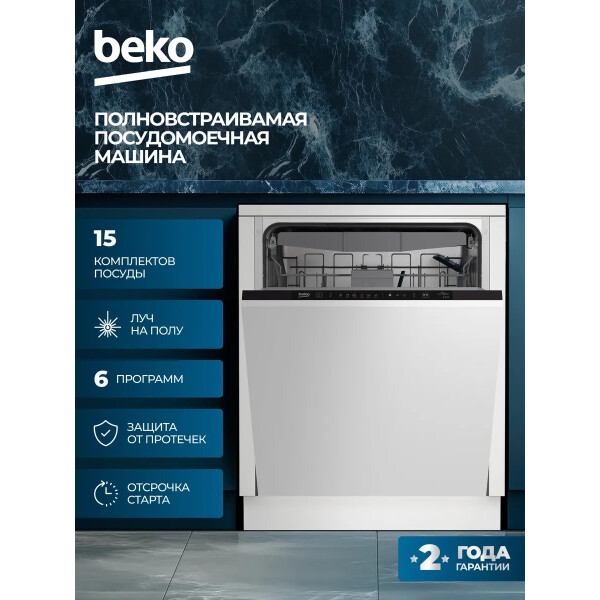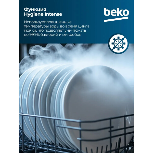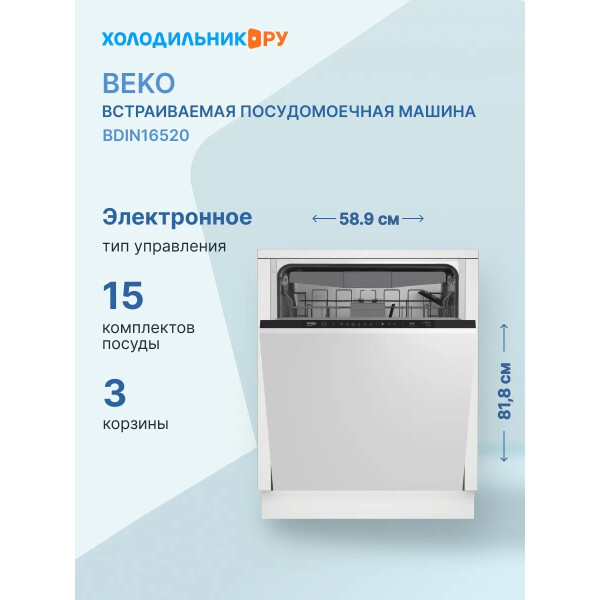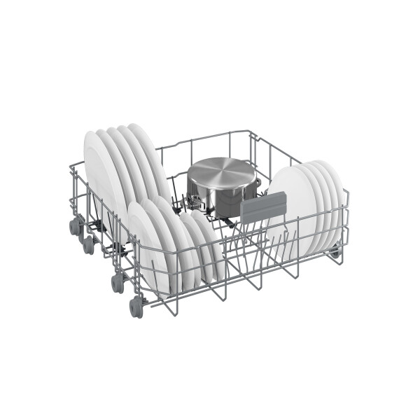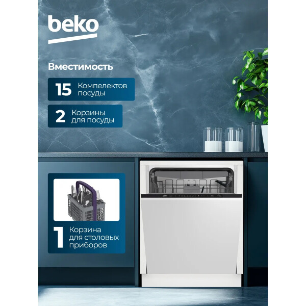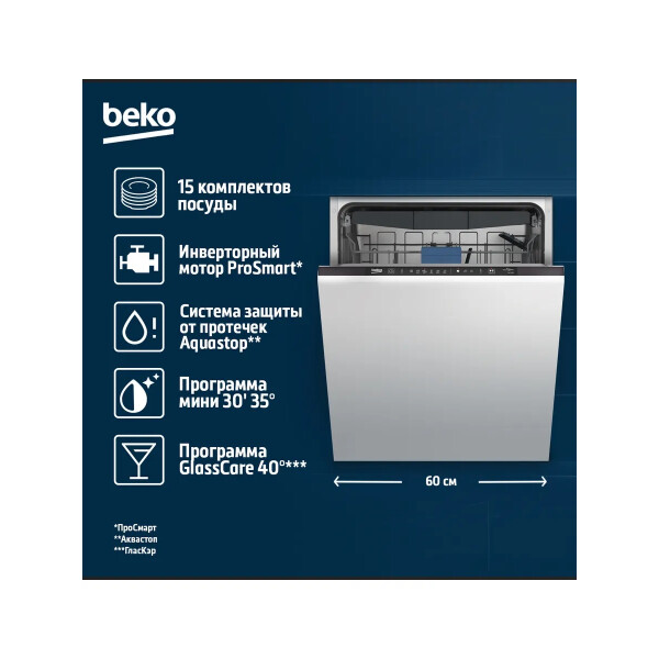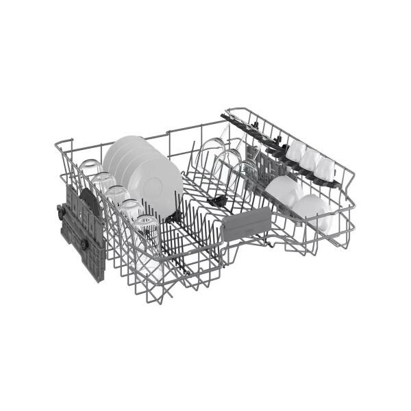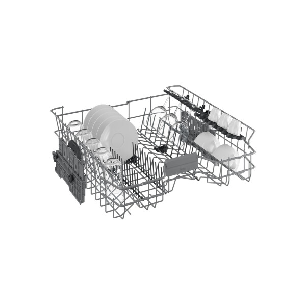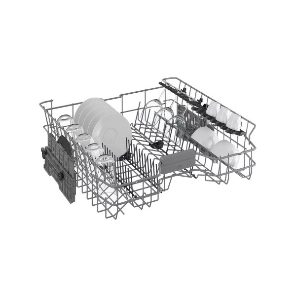 Имеет ширину 60 см и три корзины, что позволяет вместить 15 комплектов посуды за один раз.