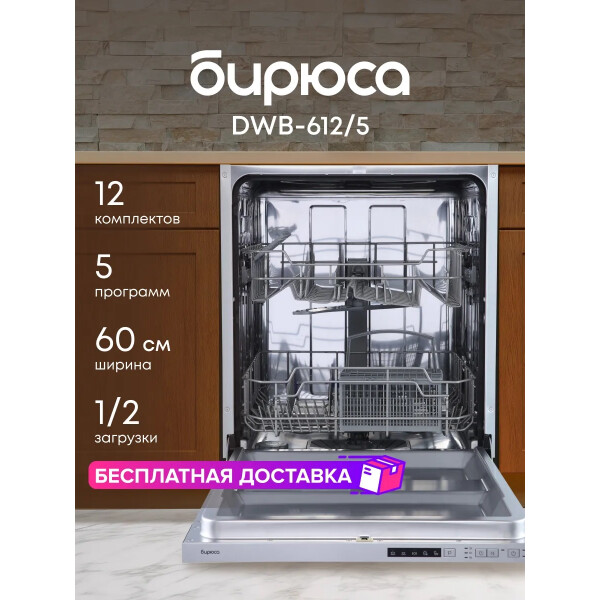 Бытовая встраиваемая посудомоечная машина Бирюса DWB-612/5 оснащена 5 программами с оптимально подобранными параметрами мойки. Оснащена таймером отсрочки запуска.