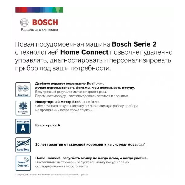 Гарантия качества Bosch: на все посудомоечные машины 10 лет гарантии от сквозной коррозии.