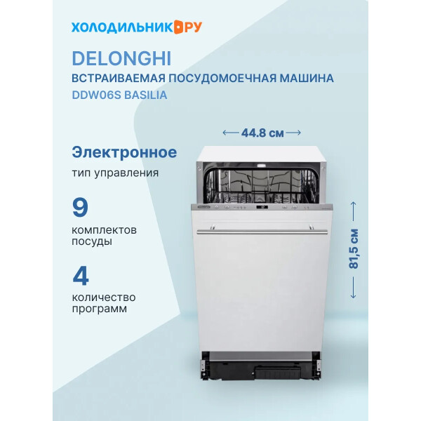 Встраиваемая посудомоечная машина Delonghi DDW06S Basilia является узкой встраиваемой моделью с шириной 45 см. Требуемая высота ниши 82 см, поэтому она подойдет для установки под столешницу. Тип сушки конденсационная, класса А. Может работать с половинной загрузкой. Допускается использование таблеток 3 в 1. Оснащена современной турбосушкой, которая гарантирует качественное высыхание без разводов даже на стекле или пластике. Delonghi DDW06S Basilia имеет полную защиту от протечек AquaStop благодаря цельнолитой внутренней камере из нержавеющей стали и продуманной сенсорной системе.