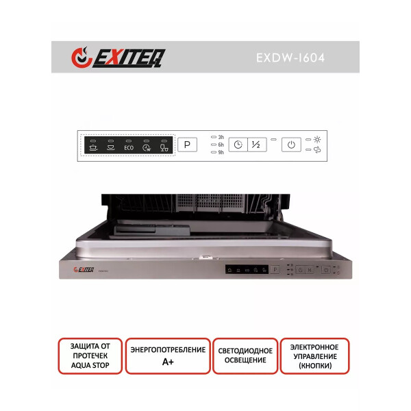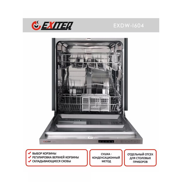 Посудомоечная машина Exiteq EXDW-I604 станет оптимальным решением для любой современной кухни. Эта встраиваемая модель шириной 59.8 см одновременно вмещает до 12 стандартных комплектов посуды. Цвет машинки - белый. Тип сушки - конденсационная. Для удобной эксплуатации предусмотрена возможность использования средств 3 в 1. Подсветка внутреннего пространства позволяет улучшить обзор моечной камеры. Безопасной работе служит система защиты от протечек. Высокий класс энергоэффективности A+ гарантирует экономичный расход электроэнергии.